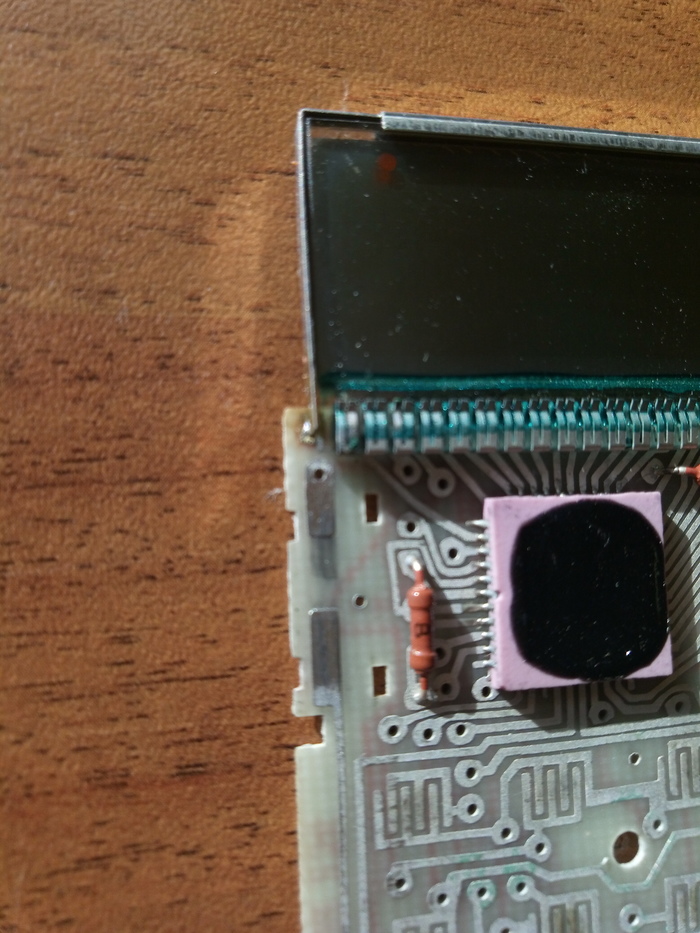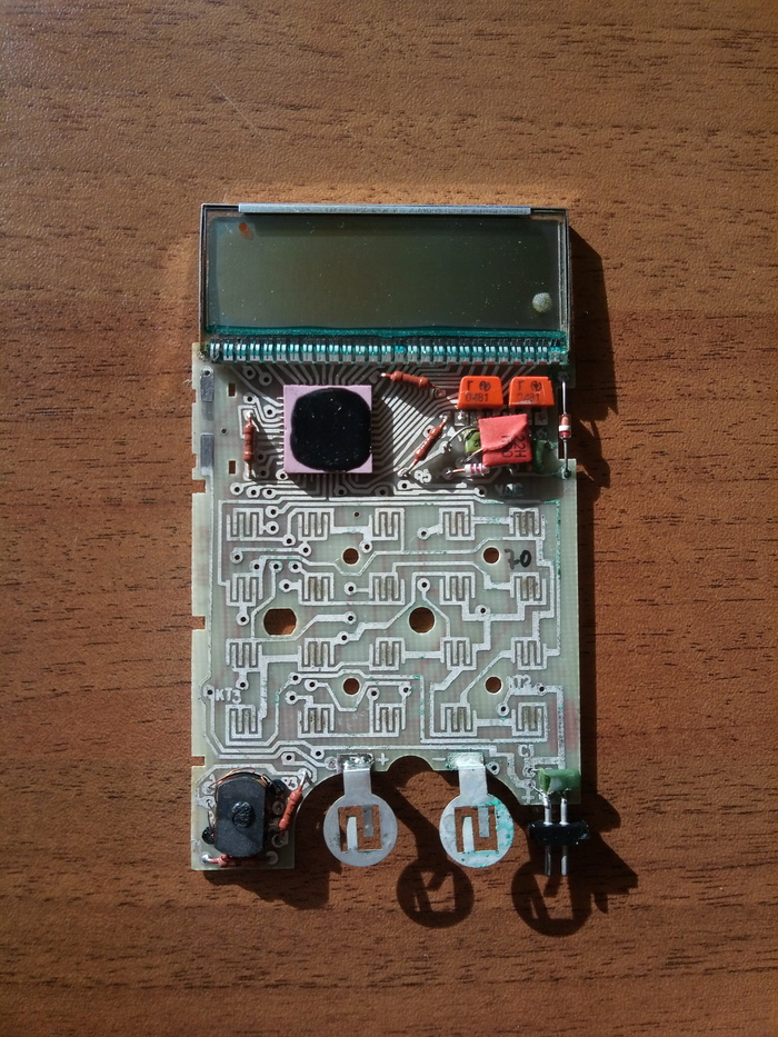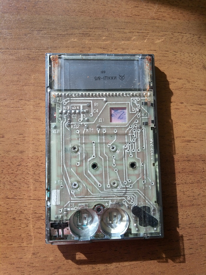 ЖК дисплей здесь стоит ИЖКЦ1 8/5, где 8 это кол-во цифр и 5 их ширина в мм. Интересно что "стёклышко" тут на самом деле поляризационная плёнка, ничем не защищённая сверху.