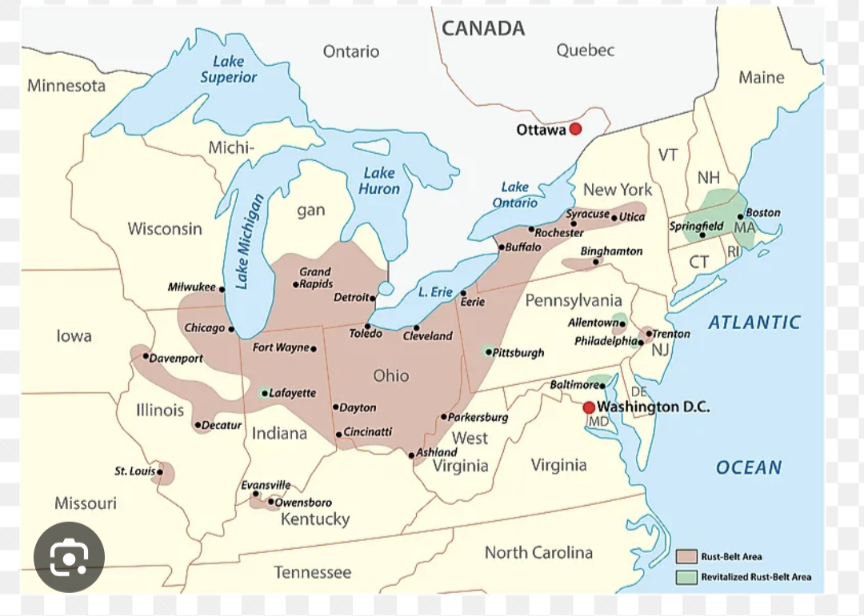 Ржавый пояс Америки - это штаты, отмеченные ржавым. Как правило, производство в данных штатах было перенесено в страны с более низкой стоимости труда для оптимизации расходов. По другой версии, производство было вероломно украдено у местных.