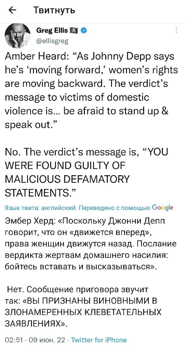 Конечно же, она не успокоилась. Её адвокат, Элейн Бредехофт практически сразу после вердикта дала два интервью (адвокаты Джонни тоже дали, но гораздо позже); сама Херд также дала интервью, отрывки из которого уже опубликованы, а полная версия выйдет 17 июля, движение #metoo заявило, что они пострадали из-за этого суда, теперь им и жертвам будут меньше верить.