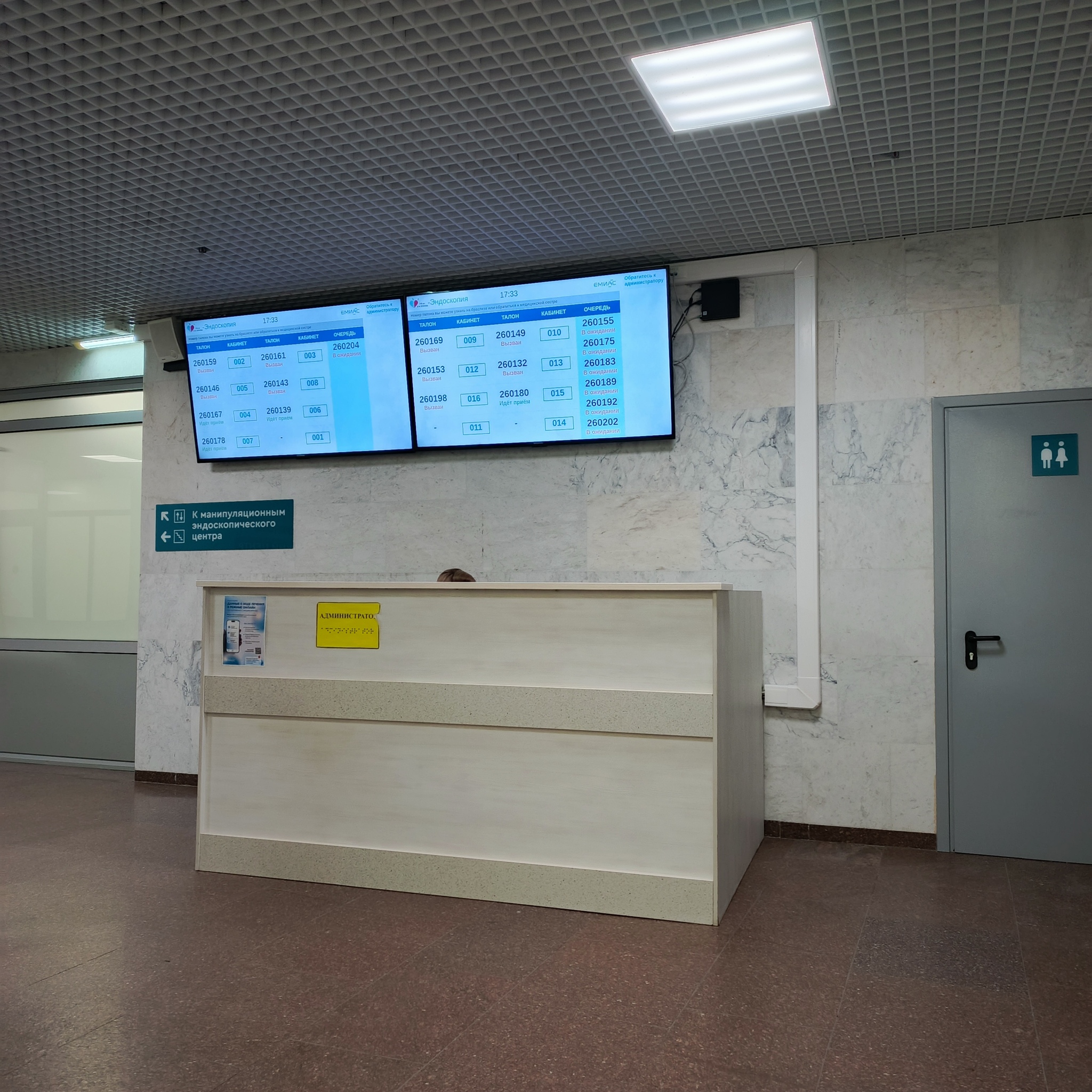 Далее перемещаетесь еще правее в зону ожидания. Что немаловажно тут же туалет, в который очень неплохо сходить непосредственно перед процедурой и исторгнуть из себя остатки воды. Времени для этого достаточно, если приехать как просят за 40 минут. На табло текущая информация.