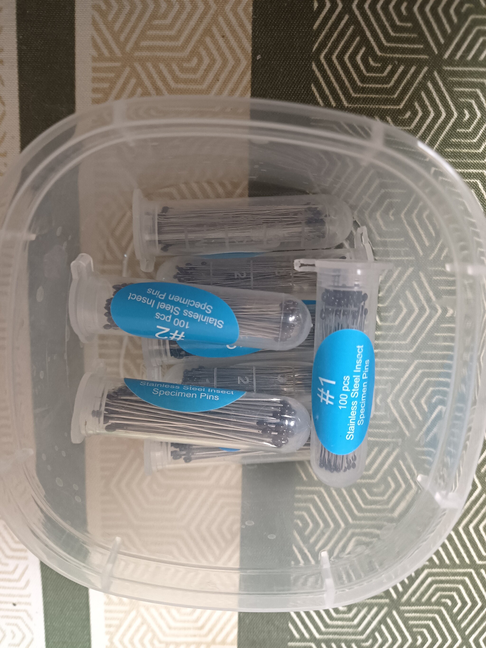Каждая упаковка чешских энтомологических булавок стоит 500-800 рублей (Китай дешевле, но они тупые и некрасивые). В этой коробочке булавок, минуций, прозрачных плашек тысяч на 20 наверное.