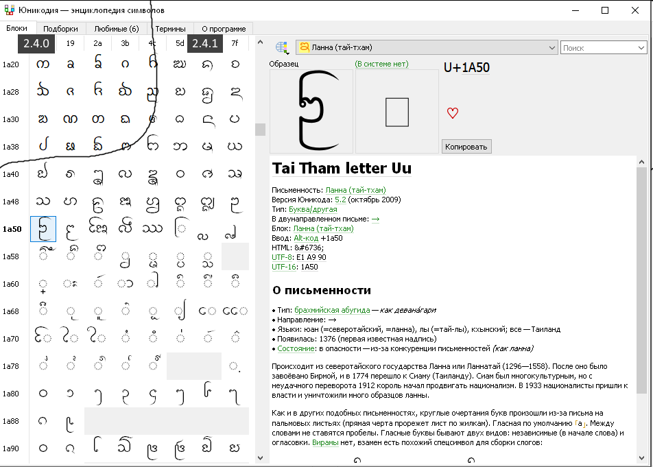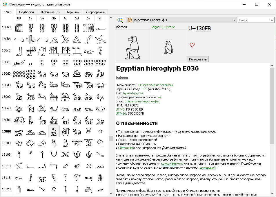 Напоминаю: я пишу программу под Windows — энциклопедию символов и самую лучшую замену стандартной Таблице символов. Качать тут. Выглядит примерно так.