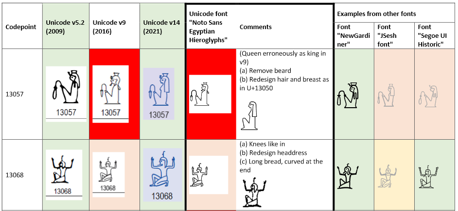 В 2009 году, когда кодировали иероглифы, их брали из трудов Алана Гардинера — историчные, но корявые. В 2016 их заменили на профессиональный шрифт, возможно, Hieroglyphica, слегка погрешив против истины. С 2021 истину стали восстанавливать.