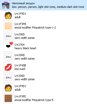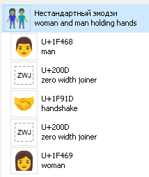 Все такие нестандартные эмодзи у меня делятся на три категории: 1) поменяны местами мужчина/женщина, мальчик/девочка; 2) существует более короткая последовательность; 3) оба сразу.