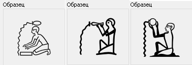 Стадия 1. Три шрифта в сумме покрывают все египетские иероглифы. Выполнено в июле, нарисовано и перерисовано несколько десятков иероглифов.