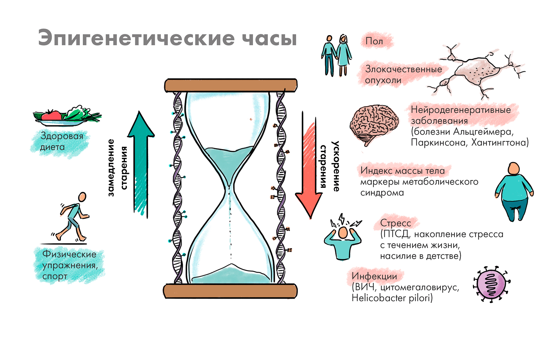 С возрастом в геноме человека происходят эпигенетические изменения - добавление или удаление метильных групп к определенным участкам ДНК. Эти изменения носят систематический характер и могут служить своеобразными "часами", отсчитывающими биологический возраст организма.
