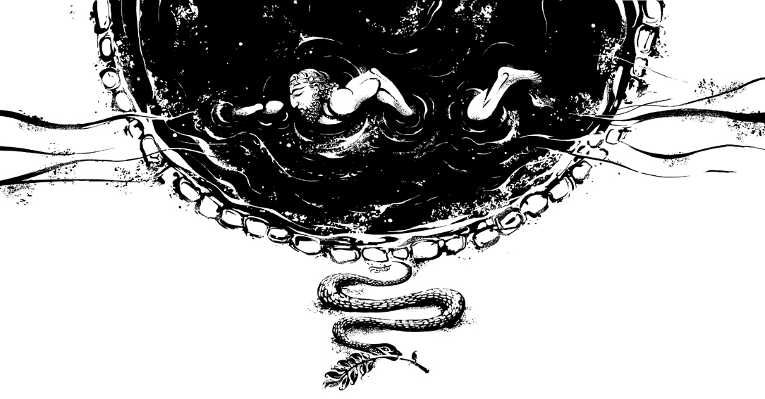 Он входит и бежит в кромешной тьме. Он ничего не видит позади или впереди себя. Это продолжается часами. В конце концов он выходит в сад, где плоды на деревьях - это драгоценности:
