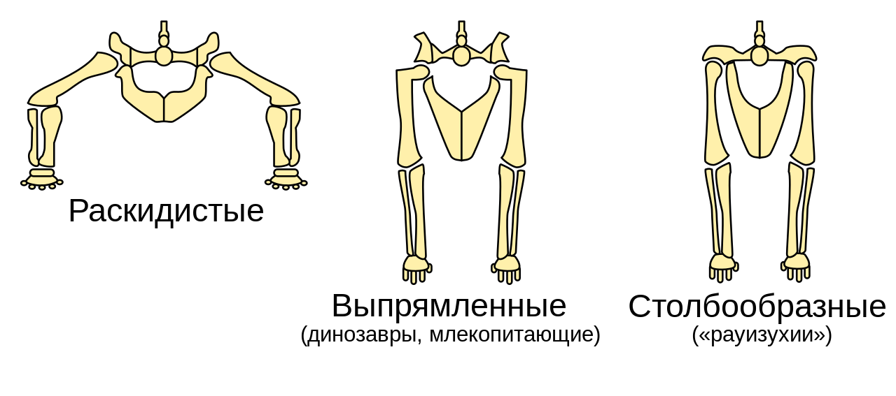 Между собой же динозавры отличались в первую очередь структурой тазовых костей. Тазовые кости динозавров были приспособлены для поддержания вертикального положения конечностей. По принципу строение тазовых костей динозавры делились на две основные группы: ящеротазовые (Saurischia) и птицетазовые (Ornithischia). Ящеротазовые динозавры, такие как тероподы и завроподы, имели таз, похожий на таз современных ящериц, тогда как птицетазовые динозавры имели таз, похожий на таз птиц. Конечно же это не единственное их отличие как от других животных, так и друг от друга, но об этом позже.