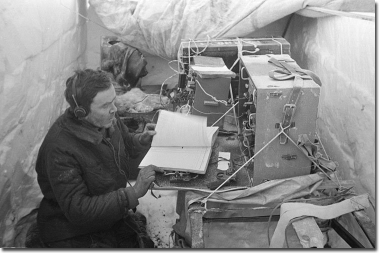 Работа дрейфующей станции завершилась в феврале 1938 года, когда льдина начала интенсивно раскалываться. На фото Кренкель передает свою первую телеграмму перед эвакуацией: отрезаны оказались две базы, технический склад, а под жилой палаткой появлялась трещина.