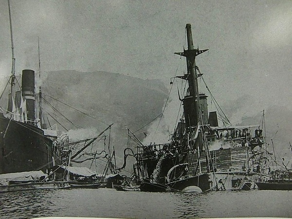 Через шесть дней после подписания Портсмутского договора, положившего конец войне, в ночь на 12-е сентября 1905 г. "Микаса"после взрыва и пожара, затонул в Сасебо. Погибло 250 (по другим данным, 114 чел.), и оказались ранеными 340 человек. Броненосец затонул на ровном киле на глубине 11 м, и первую неудачную попытку поднять его сделали 25 декабря того же года. Вторая попытка состоялась 16 января 1906 г., третья - 23 июня, но, увы, так же безрезультатно. Тогда спасатели приняли решение отказаться от применявшихся ими ранее способов подъема и окружить весь броненосец стенкой из свай, сделав тем самым импровизированный док, откачать из него воду и затем произвести необходимые работы по тщательной заделке корпуса корабля. После исполнения этой трудоемкой операции 14 августа 1906 г. была предпринята последняя четвертая попытка его подъема, увенчавшаяся успехом.