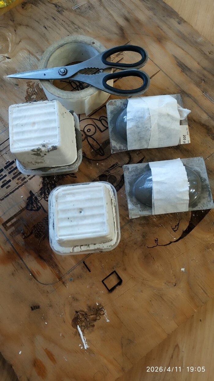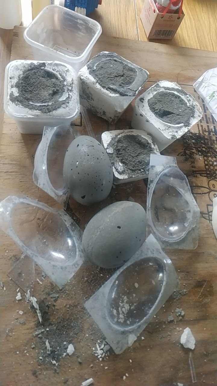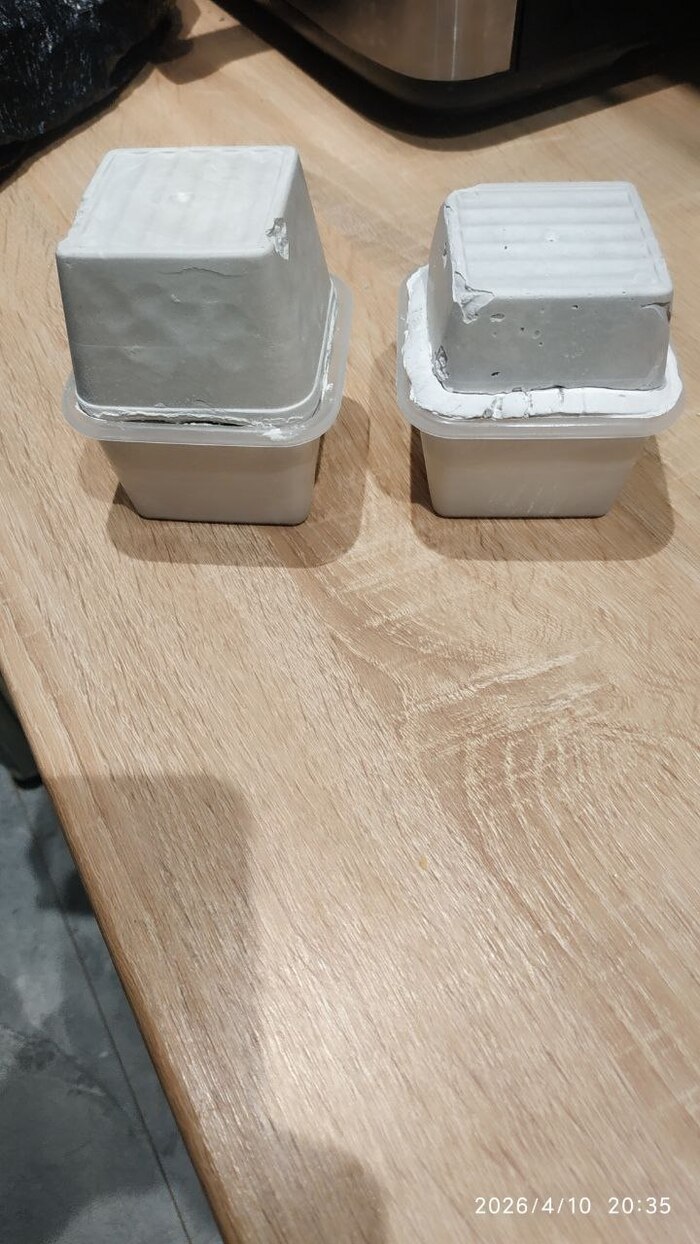 В старой кастрюльке (имея ценный опыт) залили смесь песка и цемента водой. Довели консистенцию до состояния пластилина и заложили в формочки. Пластиковые переклеили малярным скотчем, гипсовые под своим весом оставили. Утро покажет результат.