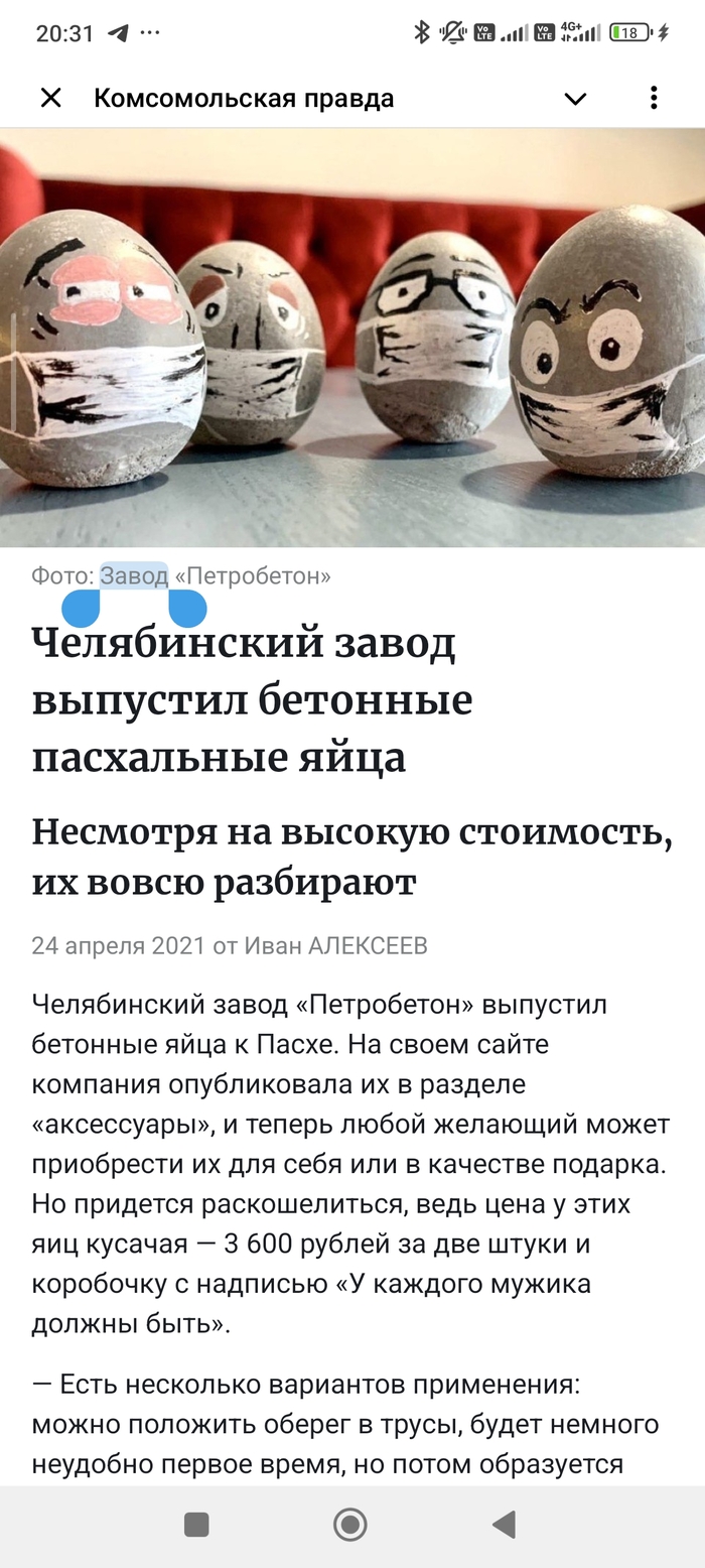 Вытащили они откуда-то древнюю новость про Челябинский завод «Петробетон» , который выпускает бетонные яйца к Пасхе. На своем сайте компания опубликовала их в разделе «аксессуары», и теперь любой желающий может приобрести их для себя или в качестве подарка. Но придется раскошелиться, ведь цена у этих яиц кусачая — 3 600 рублей за две штуки и коробочку с надписью «У каждого мужика должны быть».