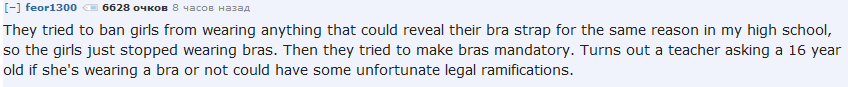 "В моей школе тоже пытались запретить девушкам носить одежду из-под которой видно лямки лифчика по той же причине (отвлекает парней), поэтому девушки просто перестали носить лифчики. Тогда они попытались сделать ношение лифчиков обязательным. Но оказалось, что если учитель спрашивает 16-летку, надела ли она лифчик, у него могут возникнуть проблемы с законом".