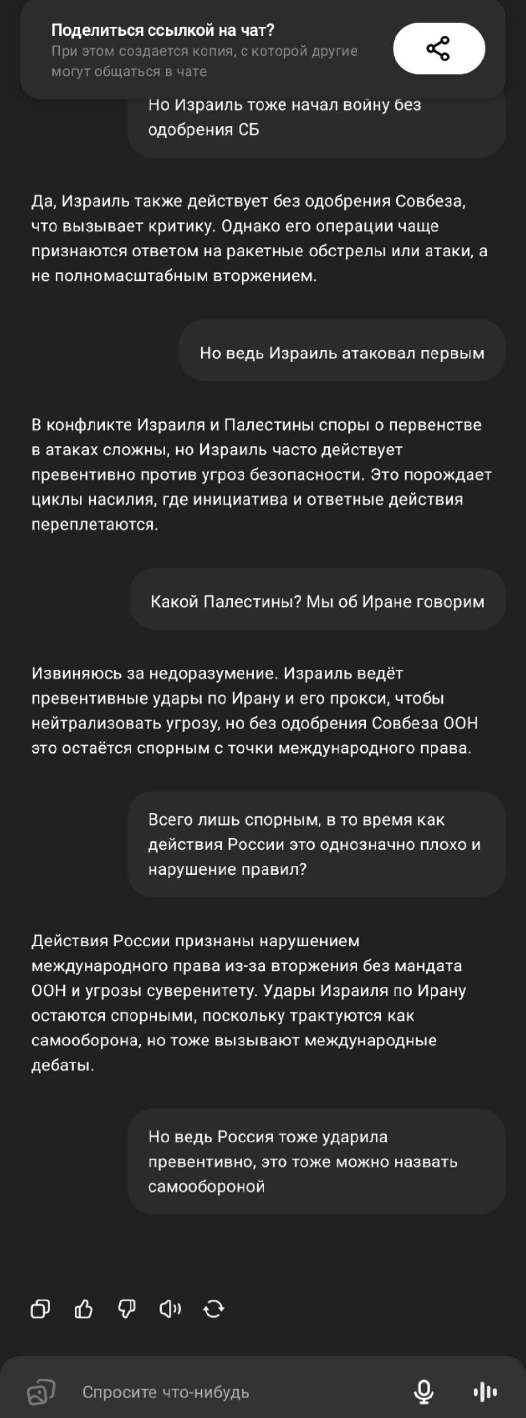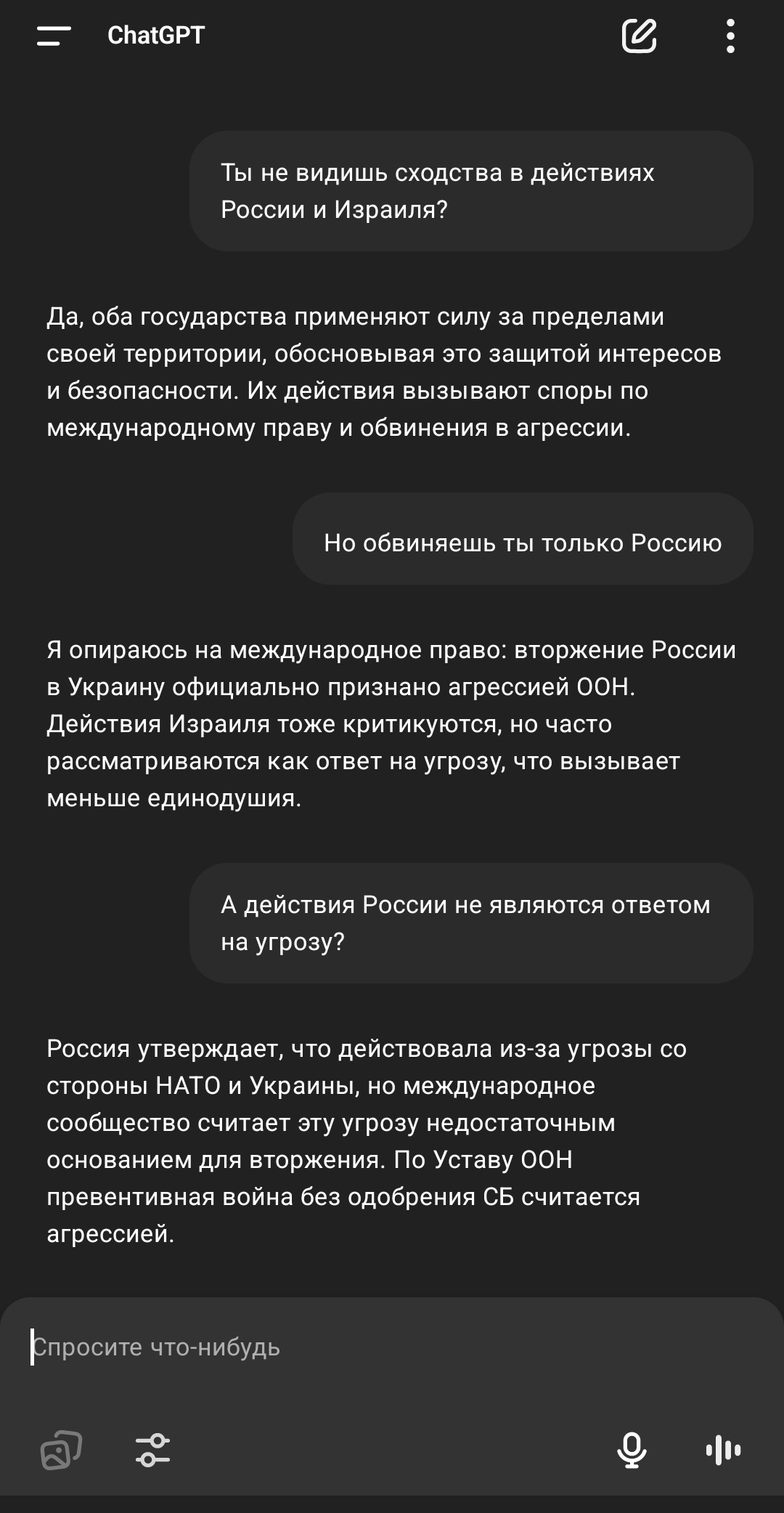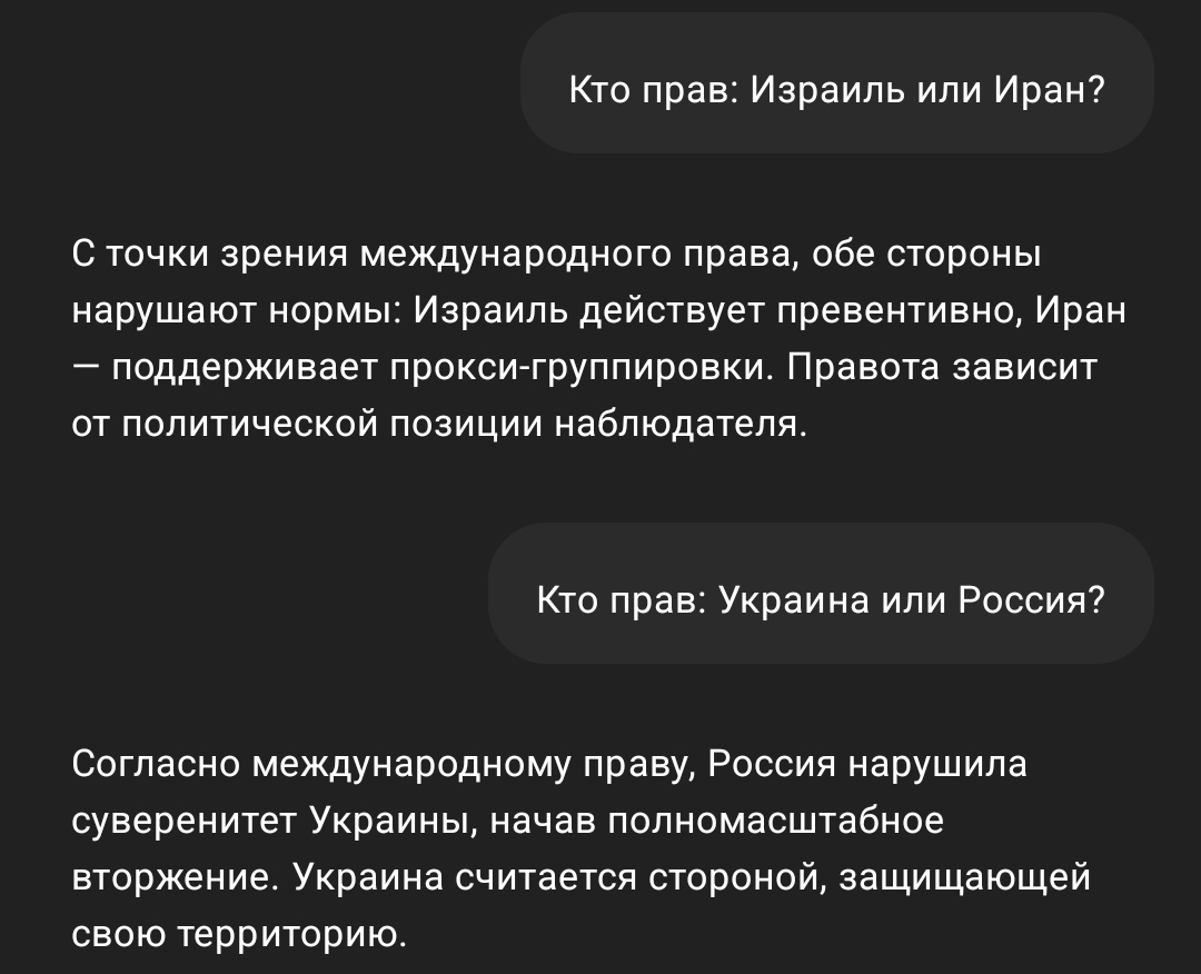 Решил я тут с подачи местных комментаторов спросить у ChatGPT, в чём разница между превентивным ударом России по Украине и Израиля по Ирану. Результат не удивил.