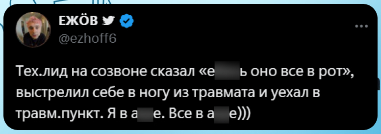 2791 tproger.official Типичный программист Это какой-то новый уровень выгорания1 1 год назад IT юмор Мат Скриншот X (Twitter) Выстрел Травматическое оружие Эмоциональное выгорание 80 9 9 8 3 Ещё 0