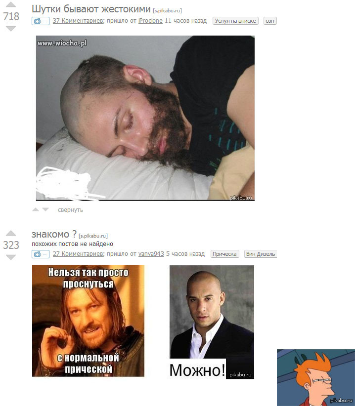 DarkSerg Это как-то связано? 12 лет назад Привет, Пикабу. Читаю я горячее, и тут вижу два поста подряд. Вин Дизель Сон Прическа Совпадение