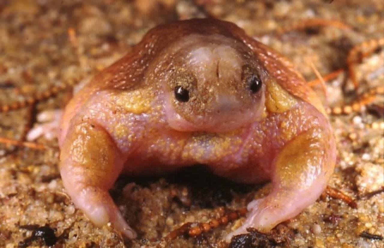У этих лягушек очень маленькая голова и короткие мощные лапки, особенно передние. Она зарывается в песок, как бы ныряя в него работая передними лапами.