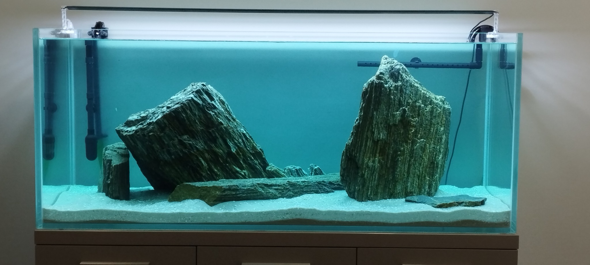 Сейчас все стоит на запуске уже неделю без всякой химии (синьки капнул 40 капель для красоты и профилактики). По рыбе планировал Викторианских цихлид, но как оказалось их не достать за редким исключением, в виде одиночных особей, доживающих свое. Поэтому уже приехали на карантин великолепные трофеусы озера Танганьики четырех видов.