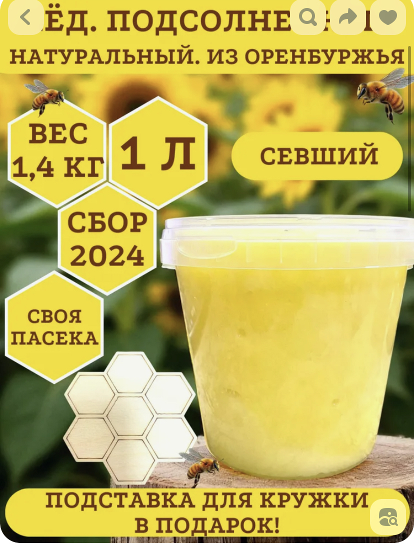 Здравствуйте! Вынужден вас огорчить - если то, что вы употребляли под видом подсолнечного мёда до момента покупки нашего натурального, качественного мёда отличалось по консистенции, вкусу и запаху от того, что вы получили от нас - вы, скорее всего, покупали фальсификат. Что ж, такое бывает нередко. Но есть и хорошие новости - теперь у вас есть эталон мёда на который вы можете равняться при выборе. Так же информирую, что я не перекупщик, а пчеловод. А это значит, что я полностью контролирую весь процесс развития пчелиной семьи и получения меда в течение всего сезона от выставки пчел из зимовника, весеннего развития до откачивания меда и подготовки к зимовке. Если у вас есть сомнения в качестве меда, пожалуйста, обратитесь в ближайшую лабораторию для проведения анализа, представляю, как вы будете удивлены, узнав, что мед 100% натуральный, зрелый, качественный. Если мои слова вас не убедили и вы не намерены проводить анализ меда - оформите заявку на возврат, я ее непременно одобрю, вы получите деньги в полном размере. Хоть продукты питания и не подлежат возврату, но наша главная цель - довольные покупатели, с каждым из которых мы стараемся выстроить доверительные, можно сказать дружеские отношения. Остались вопросы - буду рад ответить на них в переписке или по телефону, который указан на упаковке с медом. С наилучшими пожеланиями, пчеловод Морозов Максим.