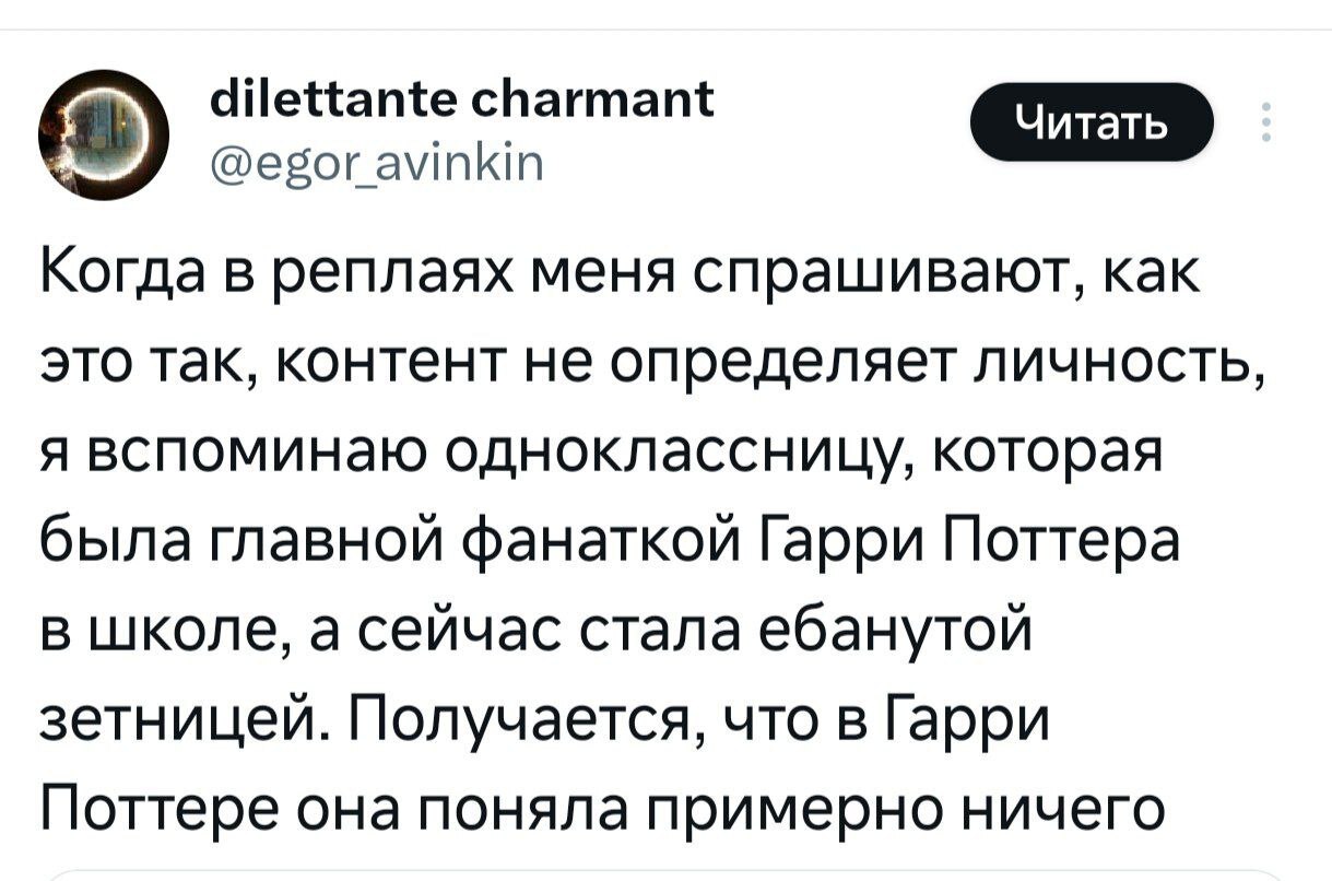 131 Ignatbrat Это она еще Таню Гроттер не читала1 1 месяц назад Политика Скриншот X (Twitter) Дичь Украинцы Бред Русофобия Двойные стандарты Гарри Поттер 69 16 4 1 Ещё 0