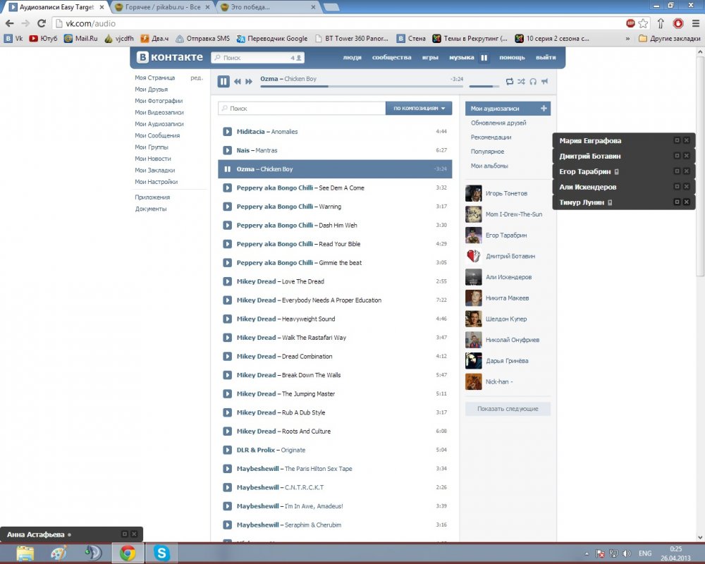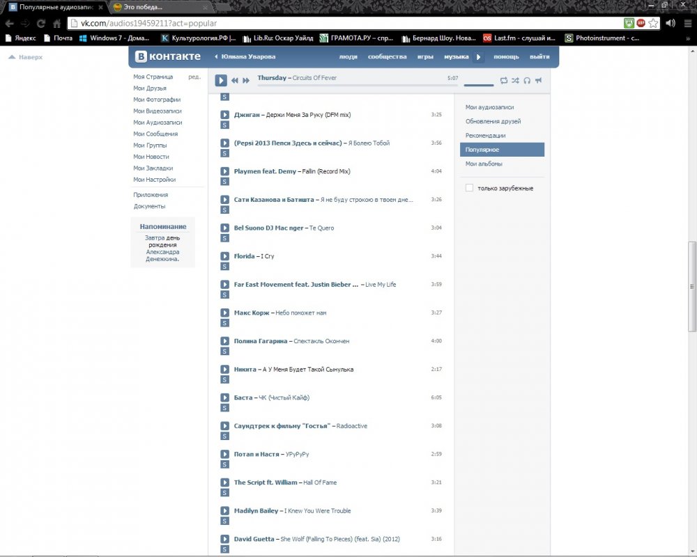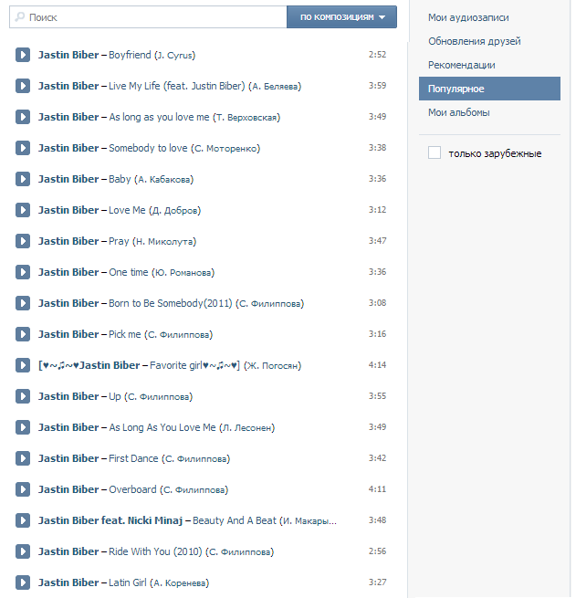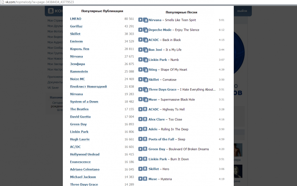 Это не популярные аудиозаписи ВК, которые обновляются с каждым часом, потому что идёт рейтинг тех, что слушается за последний час-два-три и т.п. Это рейтинг ВСЕГО ВК, созданный с помощью скрипта (как и для статистики сообщений и т.п.) - кому интересен скрипт - ищите, я сам не знаю его. Рейтинг же этот был опубликован в группе "Музыка" в ВК - ищите там его...