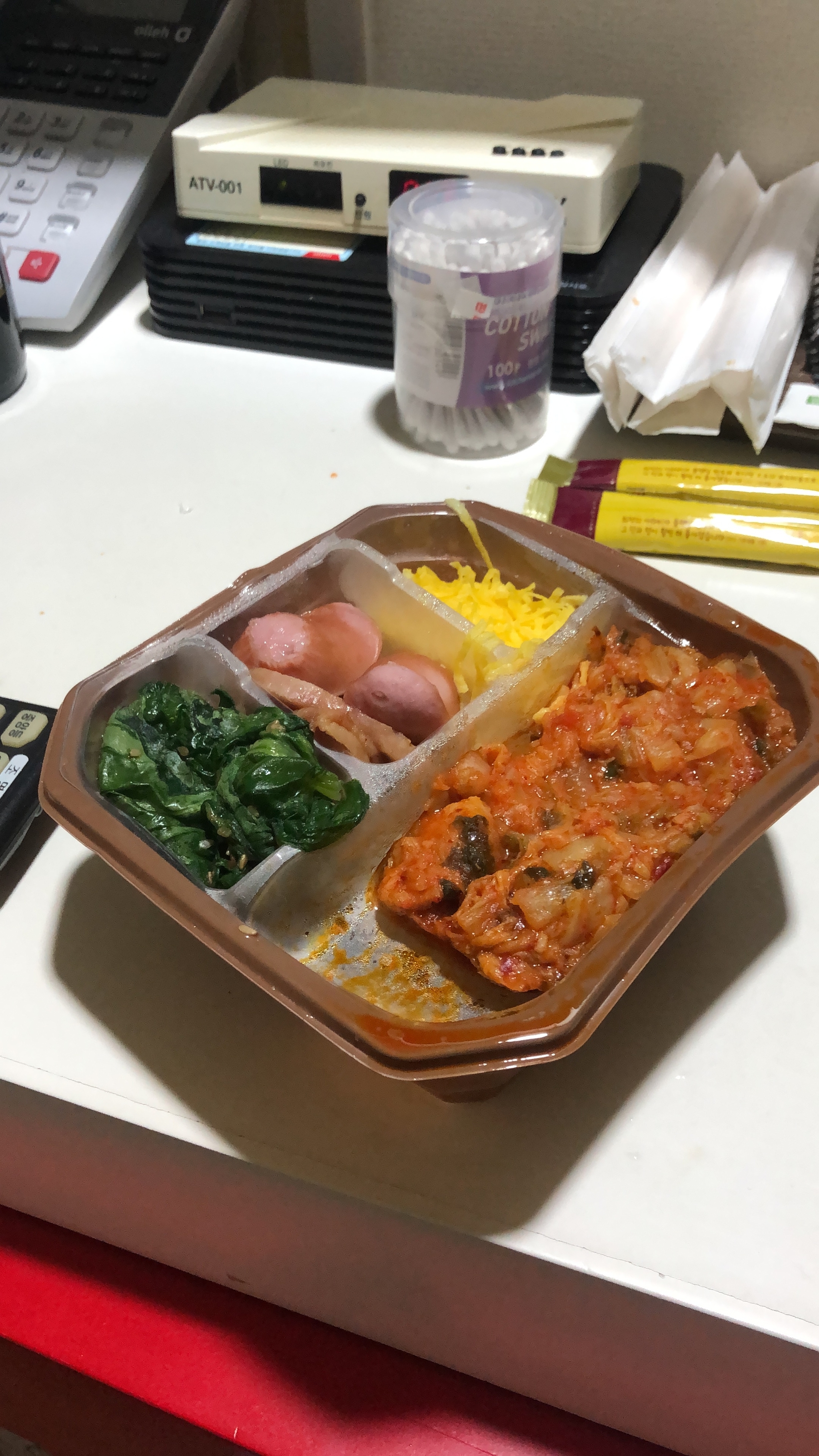 Омуль в перце, сосиски, 2 картошечки 2 наггетса, кимчи, рис и типа ветчина.