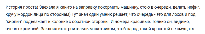 История проста) Заехала я как-то на заправку покормить машинку, стою в очереди, делать нефиг, кручу мордой лица по сторонам) Тут знач один умник решает, что очередь - это для лохов и под "кирпич" подъезжает к колонке с обратной стороны. И номера красивые. Только он, видимо, очень скромный. Заклеил их строительным скотчиком, чтоб народ такой красотой не смущать.