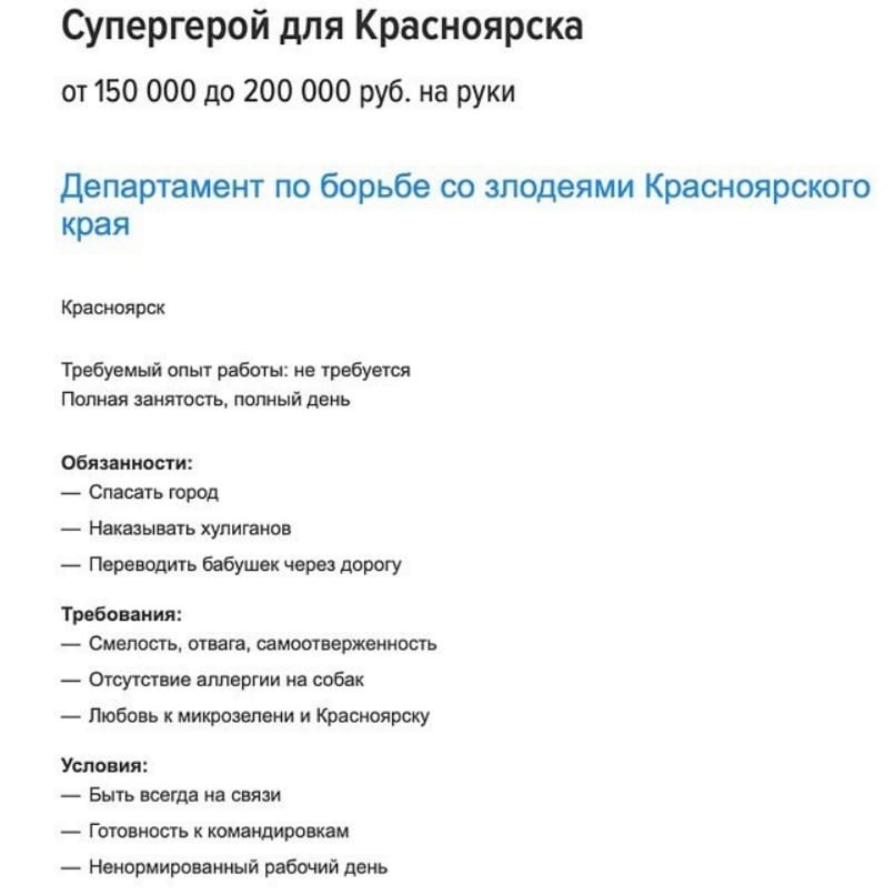 Требования и обязанности «Супергероя для Красноярска» следующие — онн должен переводить бабушек через дорогу, не иметь аллергию на собак, любить микрозелень и Красноярск.