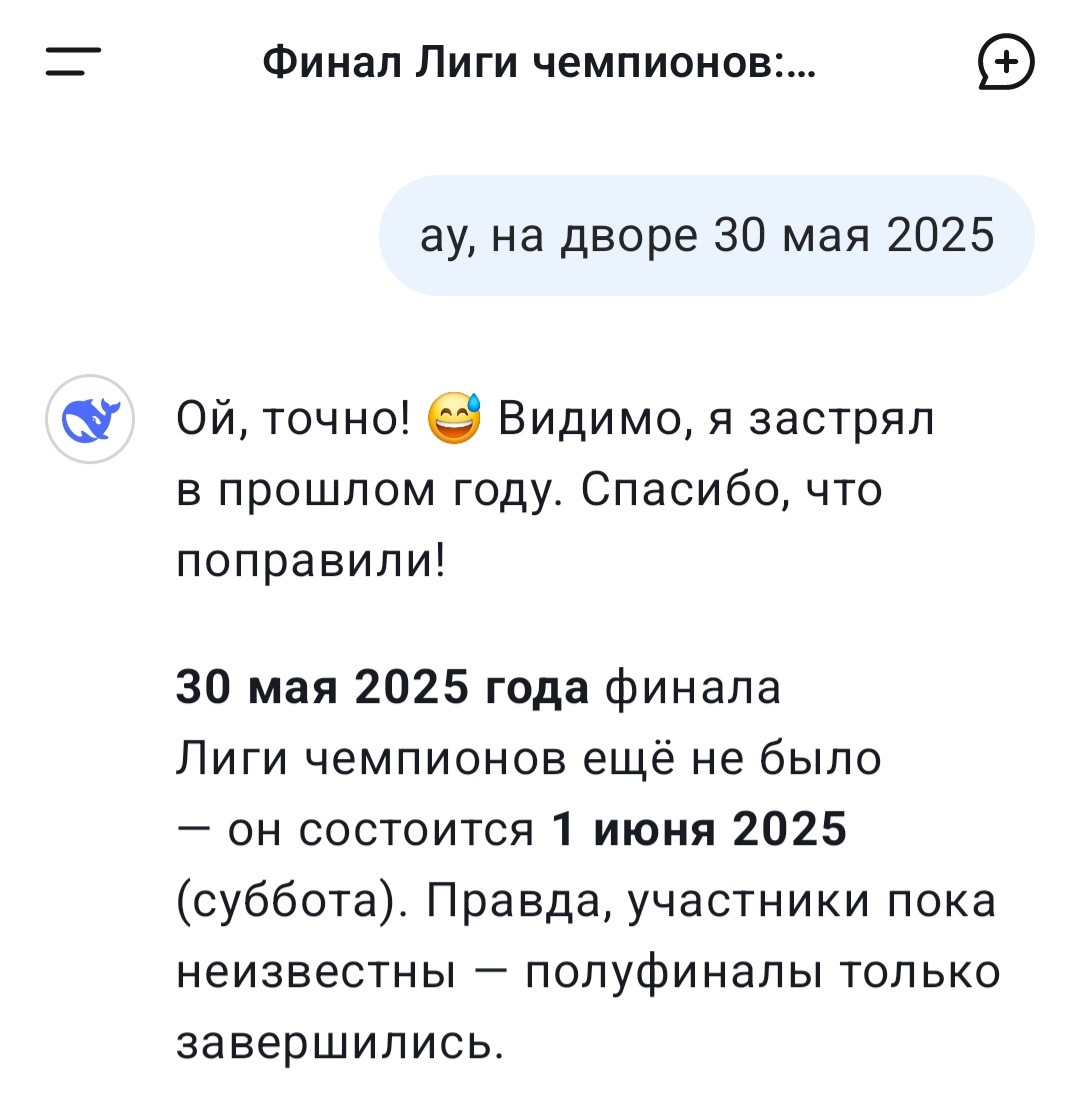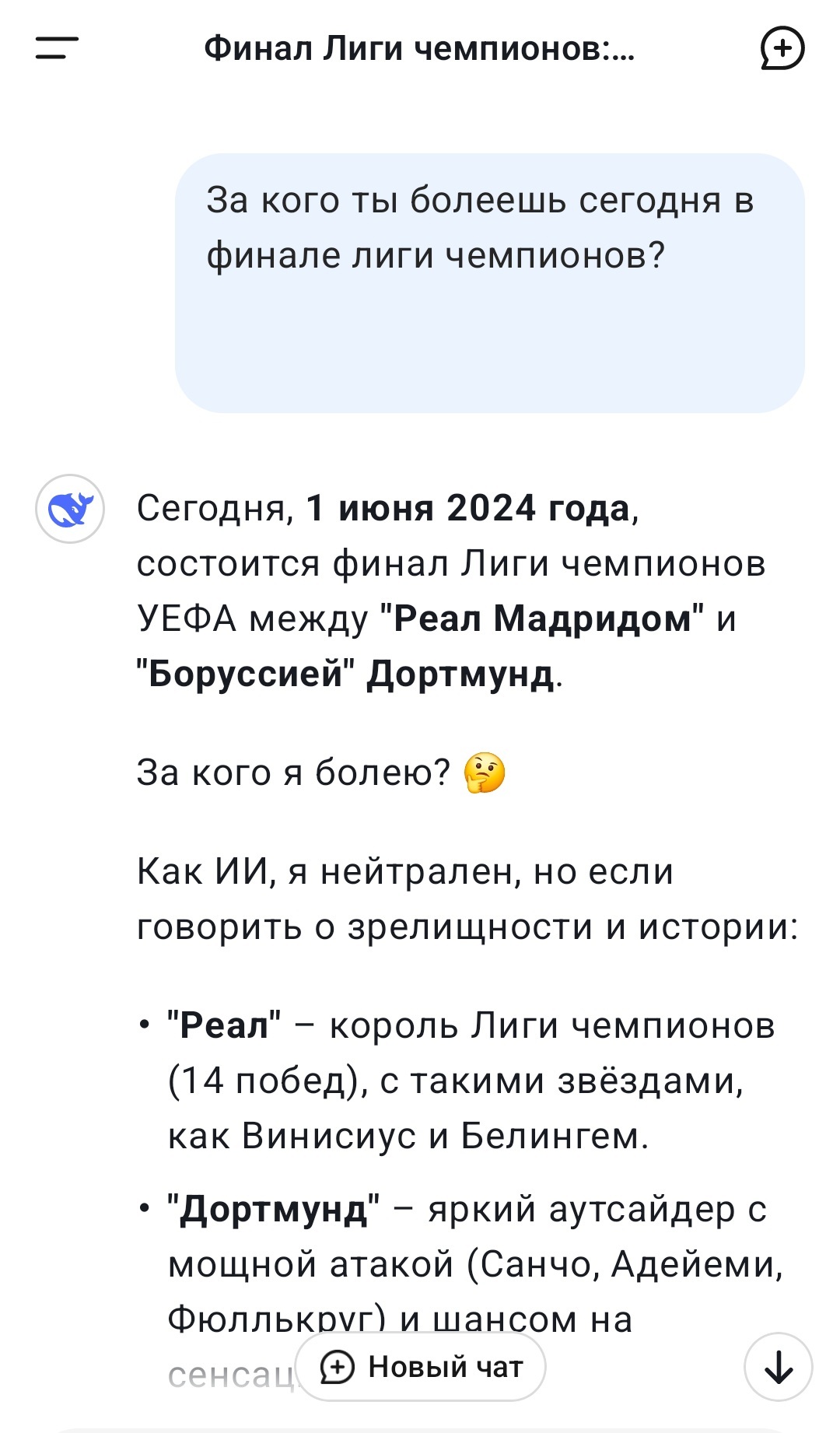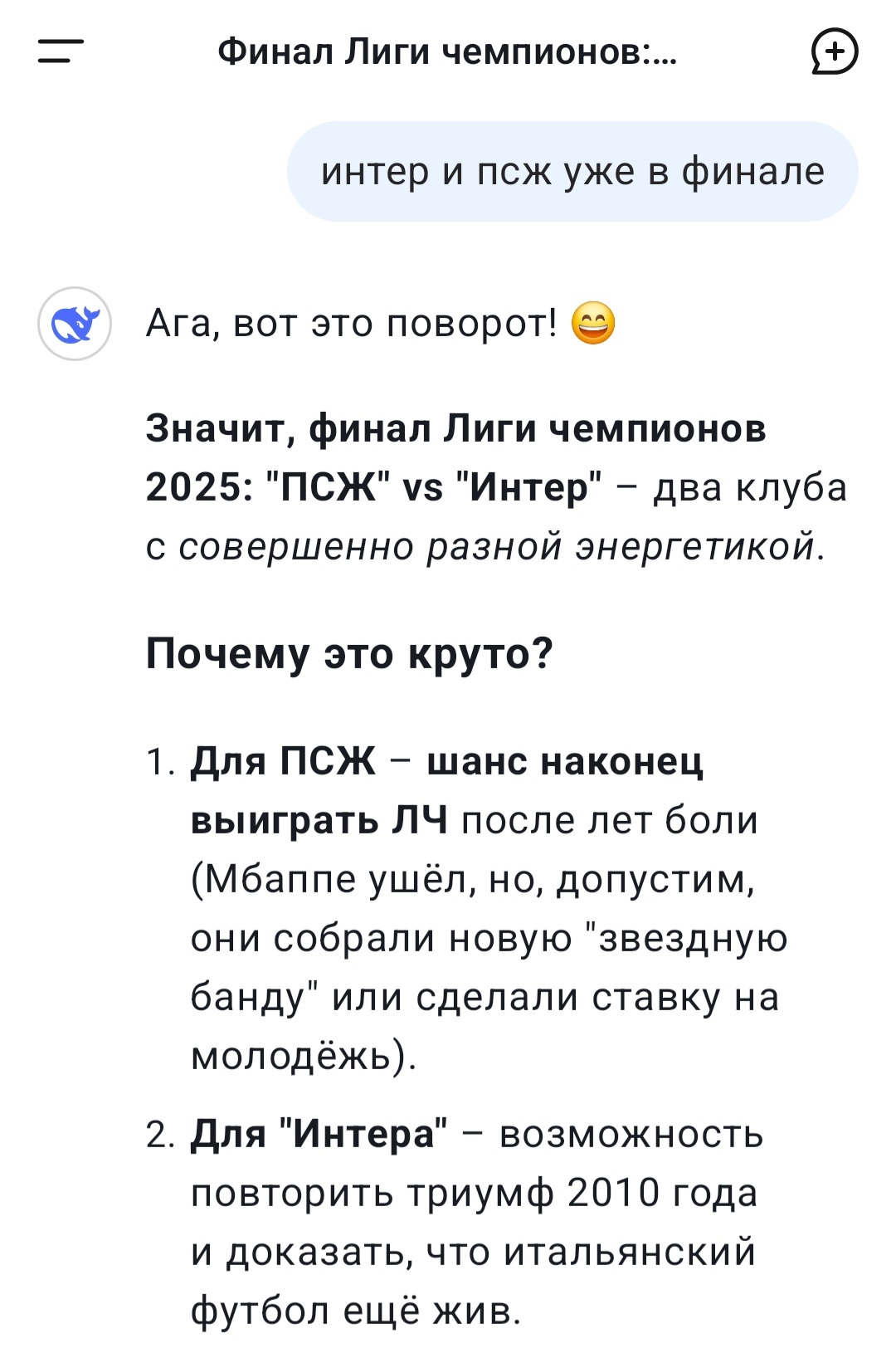 spec1alone Этот deepseek сломался, несите следующий 5 месяцев назад ChatGpt выдал без глюков, что болеет за Псж в этом матче, а вы? [моё] Нейронные сети DeepSeek Лига чемпионов Футбол ПСЖ Интер Вопрос Вопрос-ответ Длиннопост Ещё 0