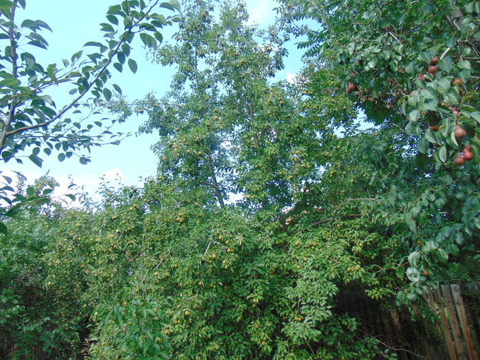 А вот третья или четвертая часть дерева перевалилась на сторону соседей. Представляете, какой урожай? Думаю, у соседей претензий не будет. И ведь остаётся на земле гнить десятки вёдер. Настолько изобильна, что, если бы сам не вырастил – не поверил бы. Чудо для Сибири. Вырастить бы штук 100… Потом одна беда – куда девать эти груши? А у меня есть семена этих груш. Но, к сожалению, сохранят ли будущие деревья качества маточного, я не знаю.