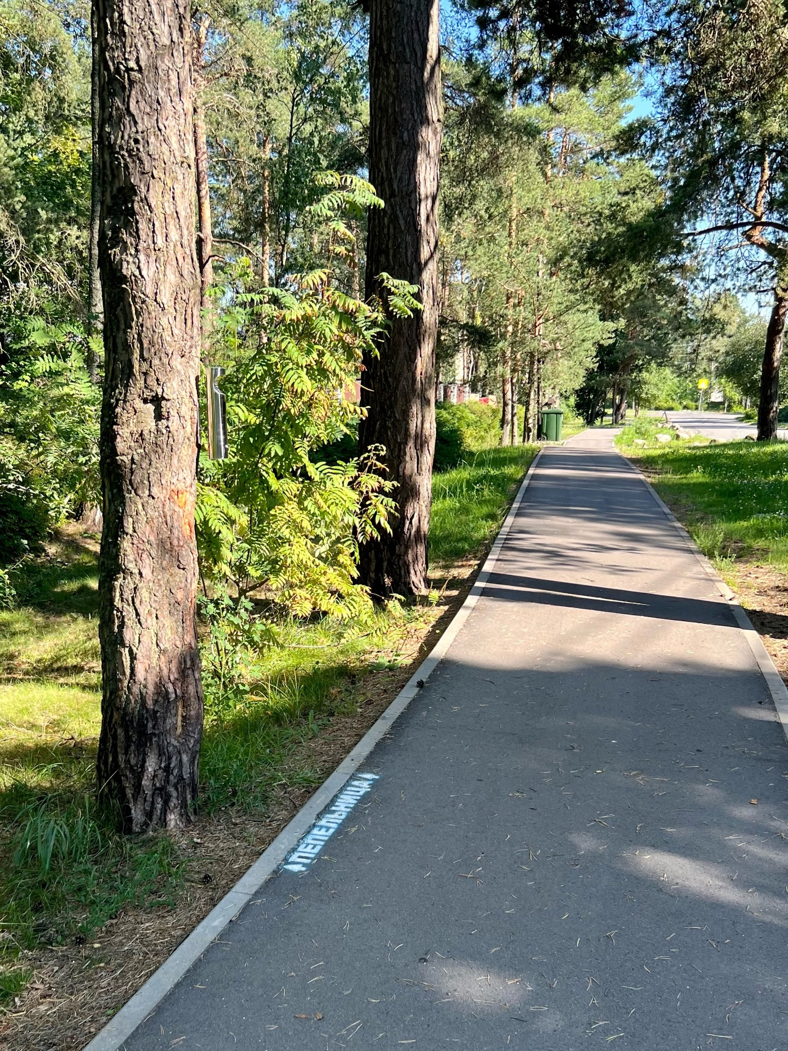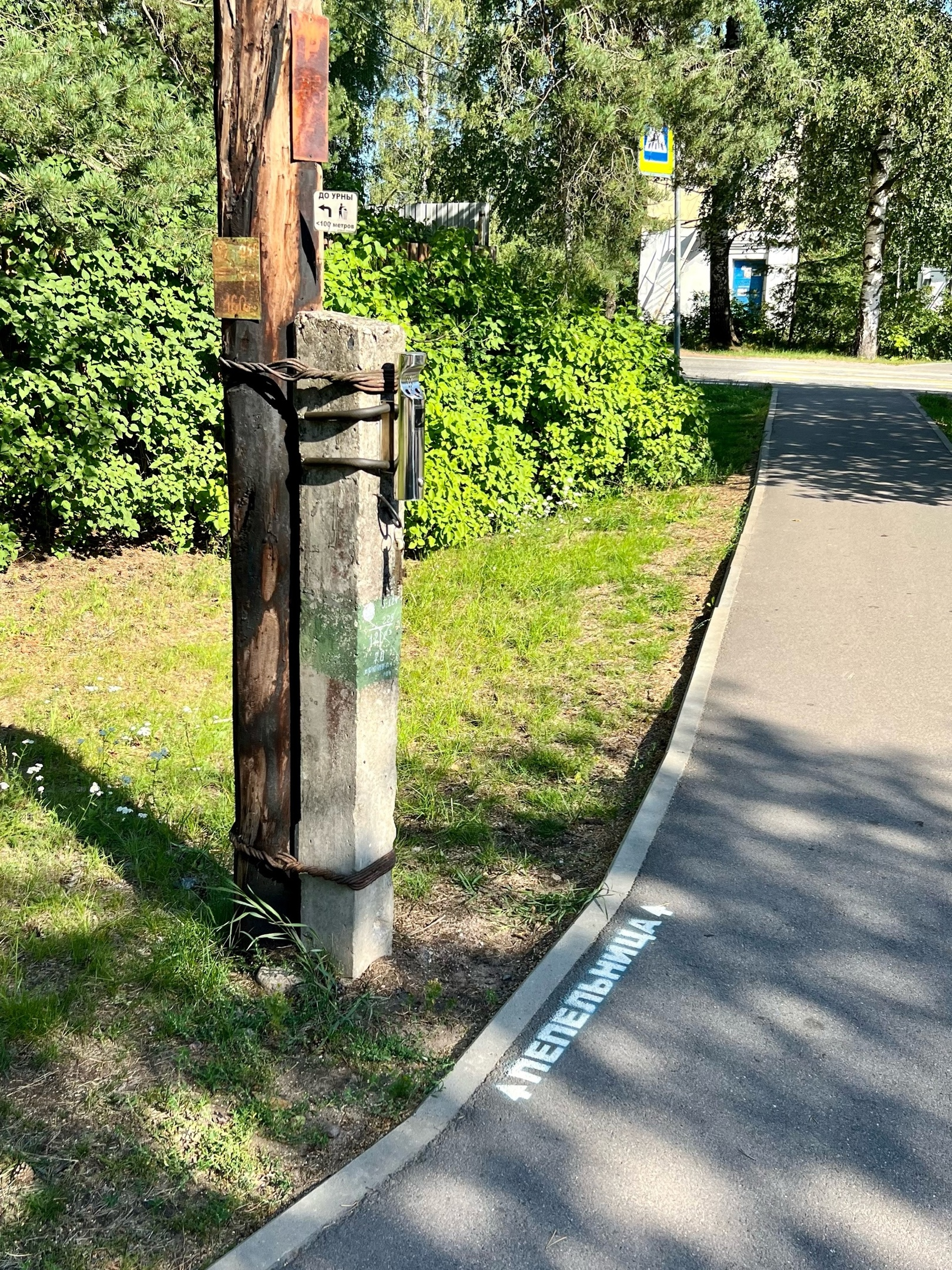 Третья появилась ещё метрах в 40 в другой стороне. Столбов в непосредственной близости от пешеходной дорожки в этом направлении не было, пришлось прикрепить к дереву: