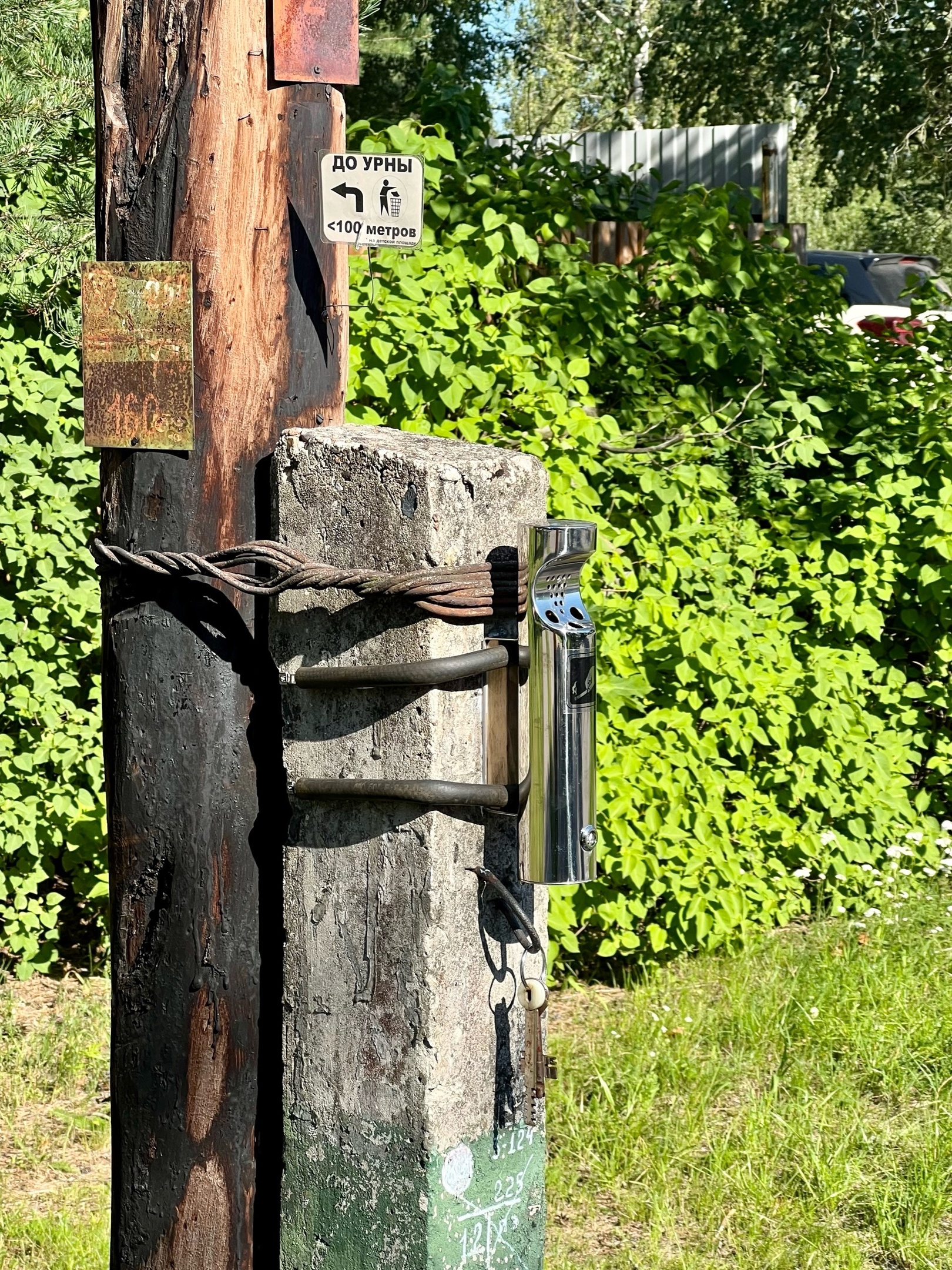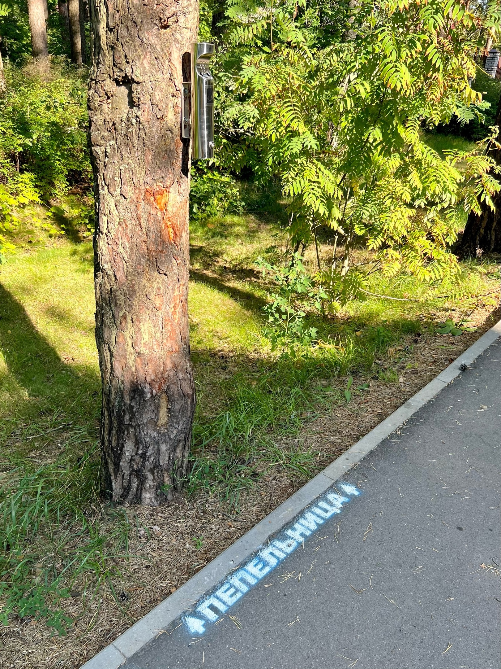 Предположу, что кто-то возмутится способом крепления – пепельница просто прикручена к дереву, но ещё советские здоровенные крюки от качелей, приколоченные к таким же соснам, подсказывают мне, что с деревом ничего не случится (одна пара крюков уже выше второго этажа выросла).