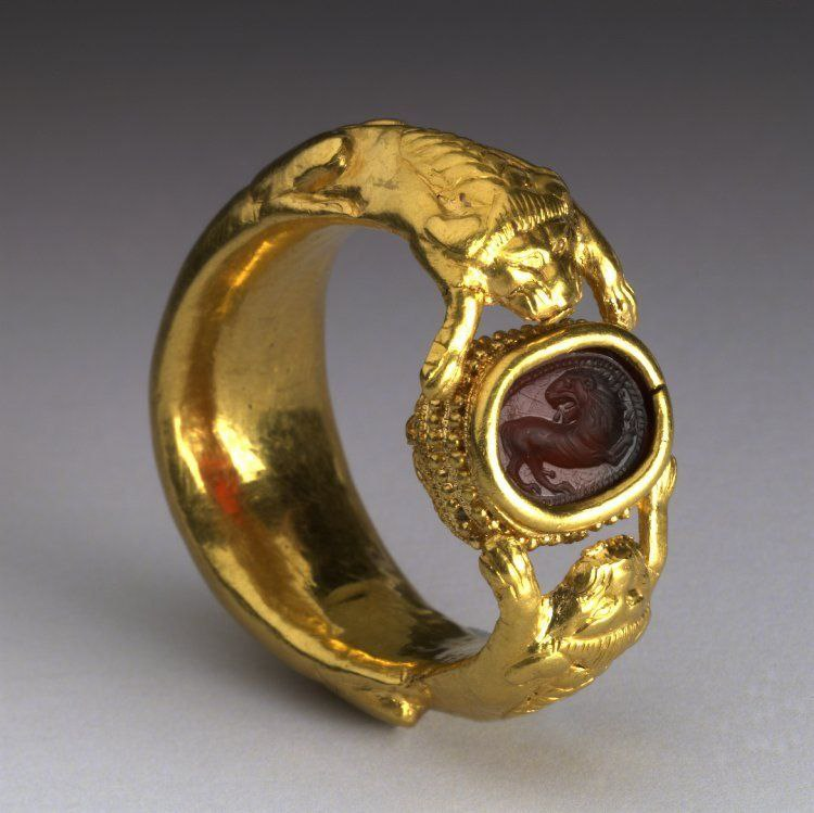 Этрусское золотое кольцо, 5-й век до нашей эры, с изображением двух сидящих львов, поддерживающих выгравированный драгоценный камень с изображением льва. Коллекция: © The Trustees of the British Museum.
