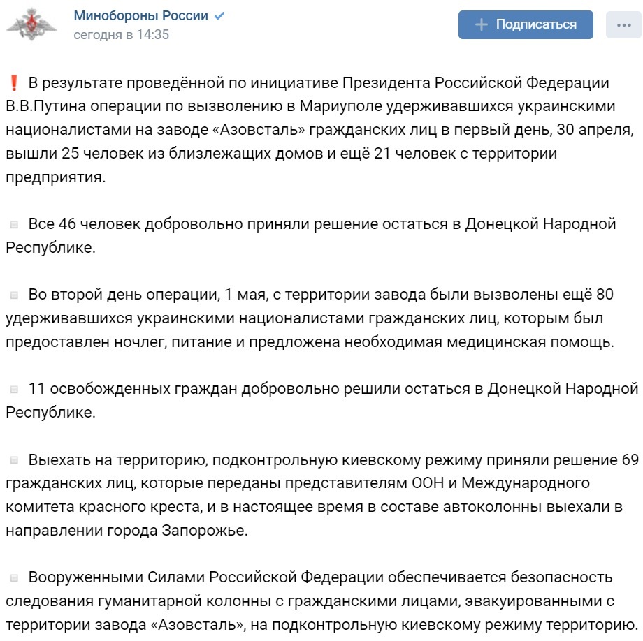 В результате проведённой по инициативе Президента Российской Федерации В.В.Путина операции по вызволению в Мариуполе удерживавшихся украинскими националистами на заводе «Азовсталь» гражданских лиц в первый день, 30 апреля, вышли 25 человек из близлежащих домов и ещё 21 человек с территории предприятия.