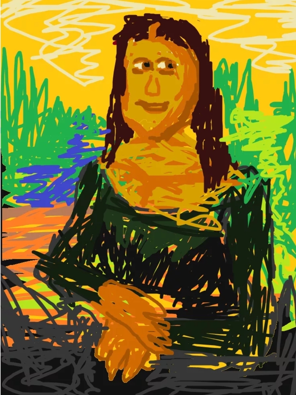 В качестве модели усадил малютку Кра — местные рептилоидихи для этого годились еще меньше. Долго бился над фиксацией нужной улыбки. Все-таки когда Кра улыбалась в полный рот, чувствительные гектоны шарахались в разные стороны. А мне бы не хотелось такой реакции на шедевр да Винчи. Какие бы слухи не ходили об ориентации маэстро. Как только я не ухищрялся с развлечением малышки — и песни пел, и наигрывал на посуде ее любимые мелодии. Все было впустую... Но как-то случайно заметил, что нечто подобное возникает на физиономии Кра, когда она нестерпимо хочет в туалет. Наконец решение было найдено — я поил малышку водой от пуза и потом заставлял часами сидеть неподвижно.