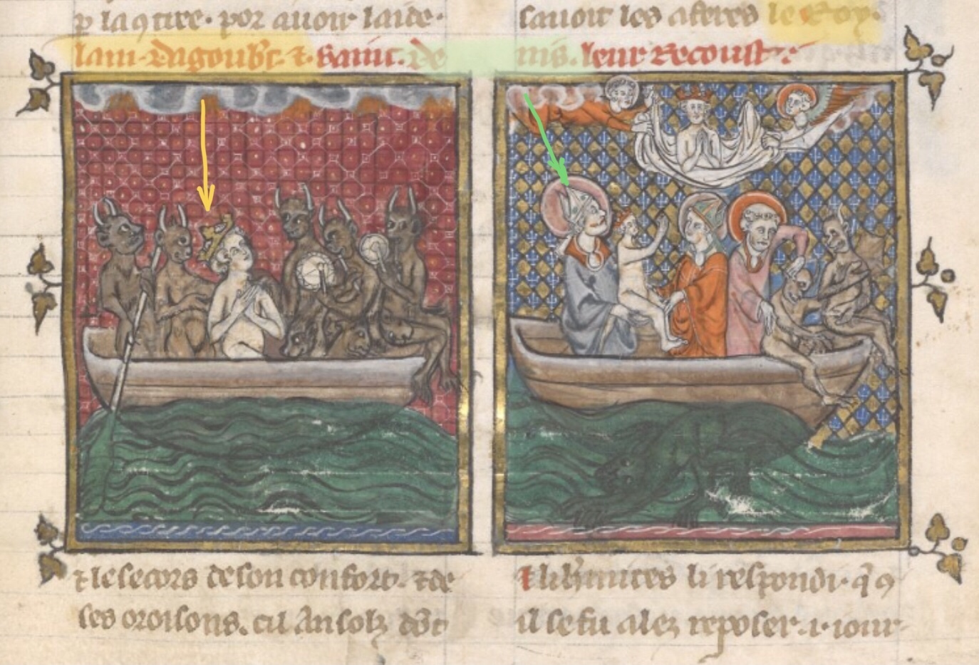 После смерти короля Дагобера I черти в лодке угоняют в ад его душу, изображаемую нагим юношей в короне. По церковному преданию, место в аду король заслужил за то, что посягал на церковные богатства. Святые Денис, Мартин и Морис спасают душу короля (правая картинка).
