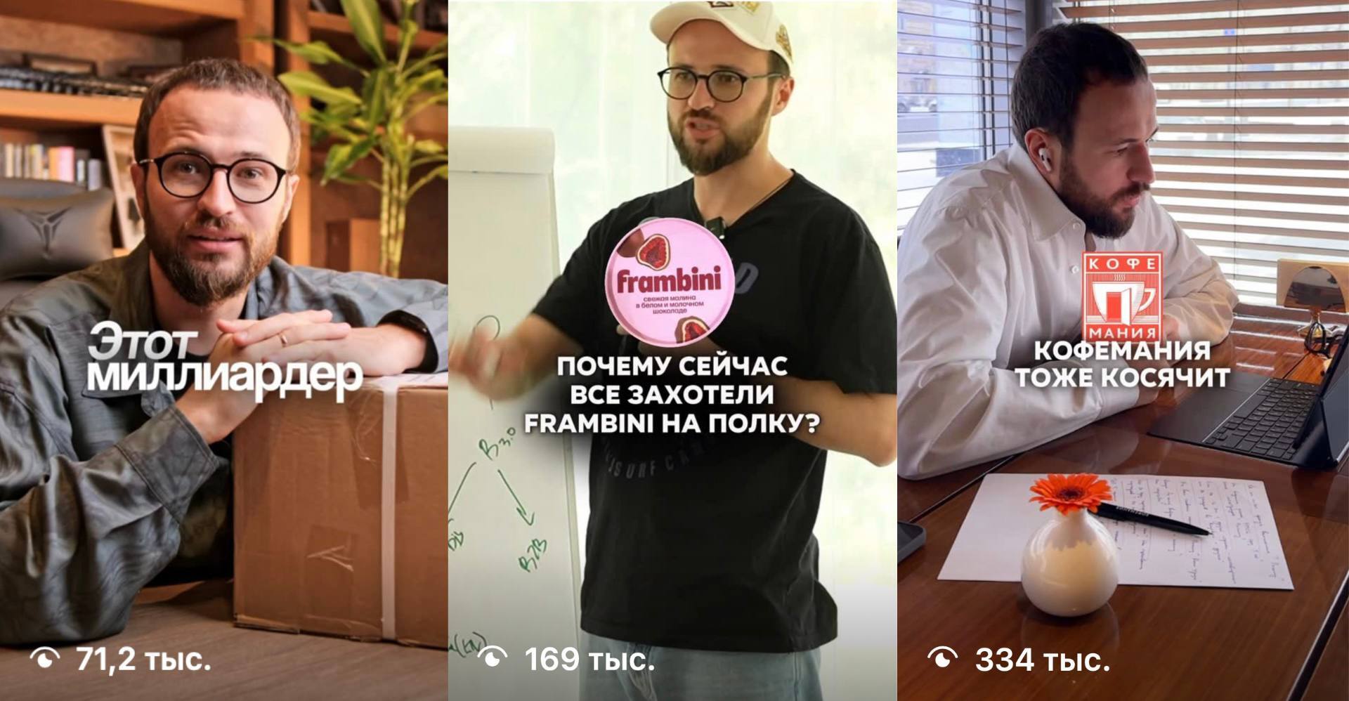 1) Чужой успех. Особенно любит обсуждать малину в шоколаде Frambini и Кофеманию. Просто пересказывает как кто-то что-то сделал, добавляя сдвг-монтаж для динамики