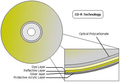 По своей конструкции диски CD-R отличались от предшественников лишь наличием еще одного слоя между подложкой и отражателем. Это слой был изготовлен из органического прозрачного красителя. У красителя было интересное свойство: под воздействием тепла он разрушался и темнел. Собственно, эти физические характеристики органического слоя и позволили реализовать возможность записи информации на диск. Во время записи лазер специального пишущего привода менял свою мощность, выжигая в слое красителя отдельные точки. При последующем чтении эти потемневшие зоны воспринимались фотодиодом как питы, или логический нуль.