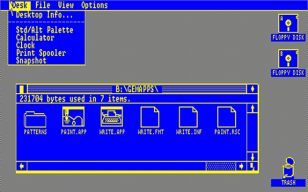 Graphical Environment Manager — это следующая графическая система, которой мы с вами коснёмся. Она была оконной и цветной (8 цветов). Работала она как проводник между пользователем и операционной системой CP/M, выход которой, к слову, состоялся в далёком 1973 году. Основной парк машин, на которых GEM работала, были построены на базе процессоров Motorola 68000 и Intel 8088. Впервые она была применена для компьютера Atari ST. Впоследствии была портирована для DOS. К сожалению, эта система не обзавелась сильной популярностью среди пользователей и компаний-производителей.