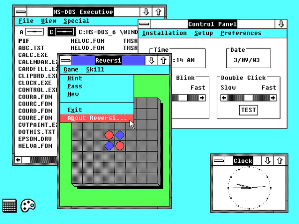Ну, и конечно, нельзя обойти вниманием великую и ужасную Windows 1.0. Для того, чтобы понять, с каким рвением Мелкомягкие продвигали свой продукт, достаточно посмотреть рекламный ролик с участием Стива Балмера. Windows 1.0 не была самодостаточной системой, она была только графической оболочкой и базировалась на MS-DOS. Данная оболочка могла предложить пользователю цветной фреймовый (мозаичный) интерфейс. Фреймовый значит, что окна не имеют возможности пересекать границы друг друга и располагаются на экране в виде отдельных фреймов. В нижней части экрана располагалась область, в которой работающие и свёрнутые в данный момент приложения представляли собой значок, при нажатии на который открывалось свёрнутое приложение. В то время эта область называлась «iconization (иконорганизация)». Интерфейс системы был цветным, что не мешало его использовать с ч/б мониторами, если вам так больше нравилось. В комплекте с оболочкой шли следующие печеньки: Write — текстовый процессор ( аналог Microsoft Word для Macintosh позволявшая работать с файлами этой программы), Paint — аналог MacPaint, игрушки, калькулятор, календарь, блокнот, а также часы. Самое важное, что стоит выделить - это наличие драйверов для 19 моделей принтеров. Изначально минимальные системные требования для установки с пяти 5,25-дюймовых дискет с Windows 1.01 были следующими: процессор Intel 8088, 256 Кбайт памяти ( но мы-то знаем, что 640 Килобайт хватит всем) и два диска для установки, один из которых должен быть дисководом, а также операционная система MS-DOS 2.x или более поздней версии. Windows очень медленно и неохотно охватывал своими щупальцами пользователей PC по большей части из-за того, что для работы с графической оболочкой требовалось докупать много чего разного, типа мыши, видеокарты и т. д. Ребята из мелкософта учли ошибки, и в дальнейшем эта линейка получила большее распространение.