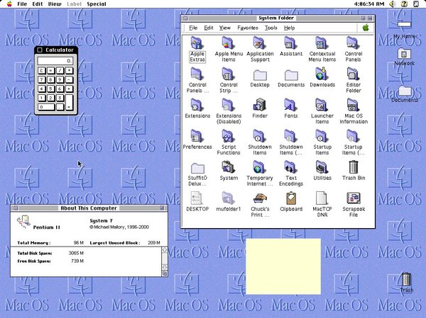 В 1991 году Apple выпускает System 7 для маков. Из нового тут: реализация виртуальной памяти, QuickTime, QuickDraw 3D (API для работ с 3д графикой), панель управления стала каталогом, Apple Menu состоит теперь из Apple Menu Items, а также включает ярлыки. Ярлыки - тоже одно из нововведений. Иконка (а вместе с ней и сам файл) теперь могут быть перемещены с помощью «Drag and drop», т. е. пользователь захватывает указателем иконку перемещает её и отпускает в другом месте, функция создания шаблона — позволяет пользователю создавать шаблон, часто используемые стили документов, всплывающая подсказка, масштабируемые шрифты и многое другое. Но, пожалуй, самое примечательное — новый оцветлённый интерфейс.