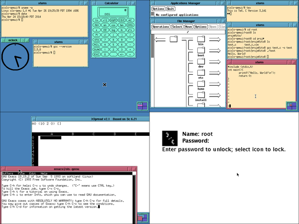 Хоть линукс и появился в 1991 году, широкую популярность он приобрёл чуть позже. Об истории линукса можно писать не одну статью, так что не будем сильно отдаляться от заданной темы, а именно от пользовательского интерфейса. Если вкратце, X Window System был перенесён (портирован) на платформу линукса чуть позже чем сразу, соответственно, это позволило поднимать на нём различные менеджеры окон, и, соответственно, сам интерфейс в зависимости от конкретного менеджера был разным. Приведу в пример один из первых дистрибутивов Linux - SLS (Softlanding Linux System). Он выпускался в 1992-1994 годах. На скриншоте показана система, имеющая в своём составе следующее: Linux 1.0, GCC 2.5.8, XFree86 2.0, TeX 3.141, fvwm 1.21c. За декорацию окон в данном случае отвечает fvwm, а оконной системой является XFree86 (разновидность X системы). Именно желанием модифицировать (или просто ненавистью к) SLS было продиктовано решение создать Debian и Slackware.