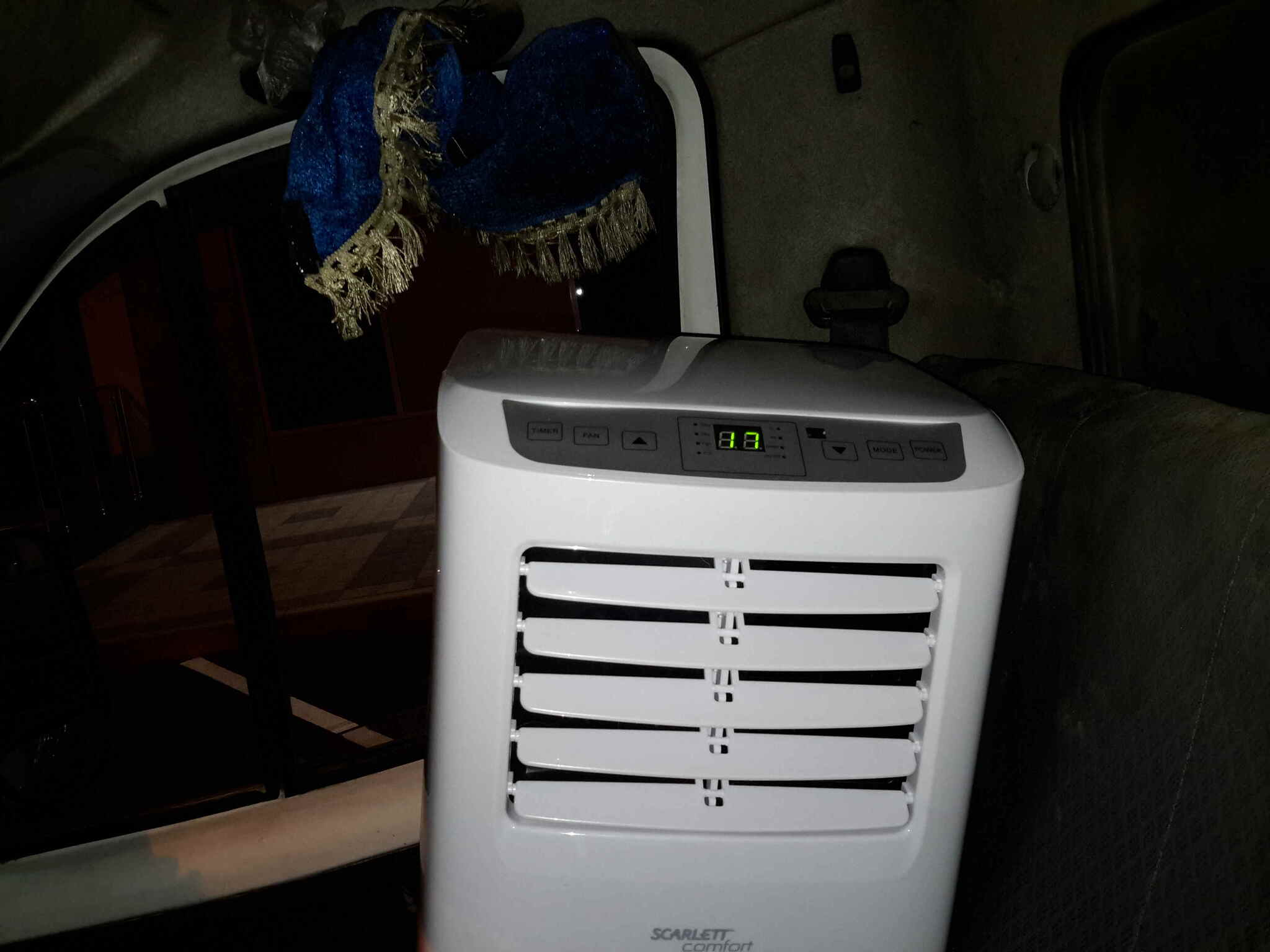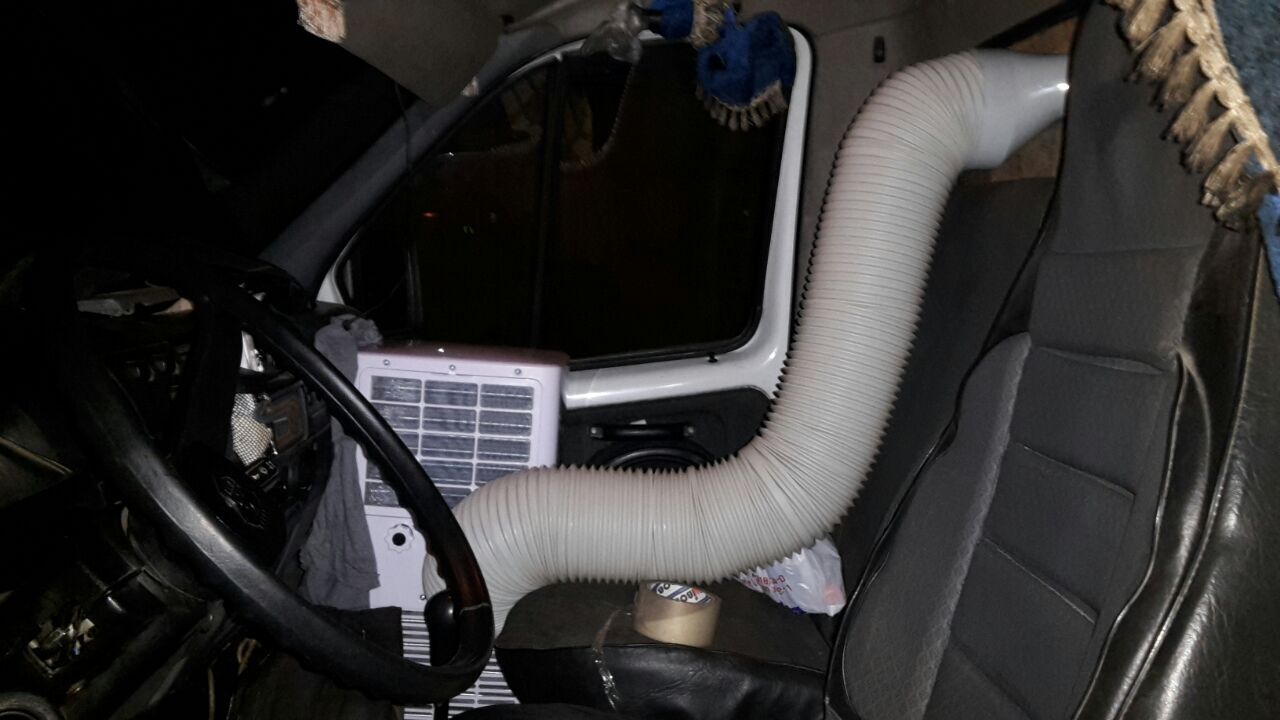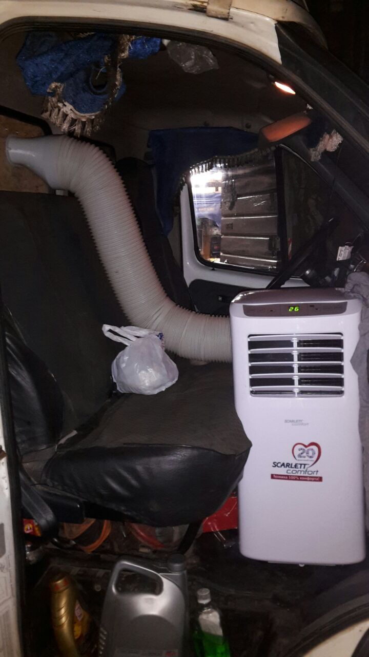 Несмотря на поломку сплита, у меня оставался преобразователь с пусковым током на 4 кВт ( т. е. по сути в машине осталась мощная квартирная розетка), и я пошёл по простому пути: я купил мобильный офисный кондиционер от 220 вольт, с толстой гофрой, для вывода воздуха наружу. Эта система проработала пару лет, после чего, у меня через лобовое стекло и крышу во время дождя в салон стала поступать влага, как раз в то место, где стоял преобразователь (возле правой ноги пассажира), и преобразователь перестал выдавать мощность.