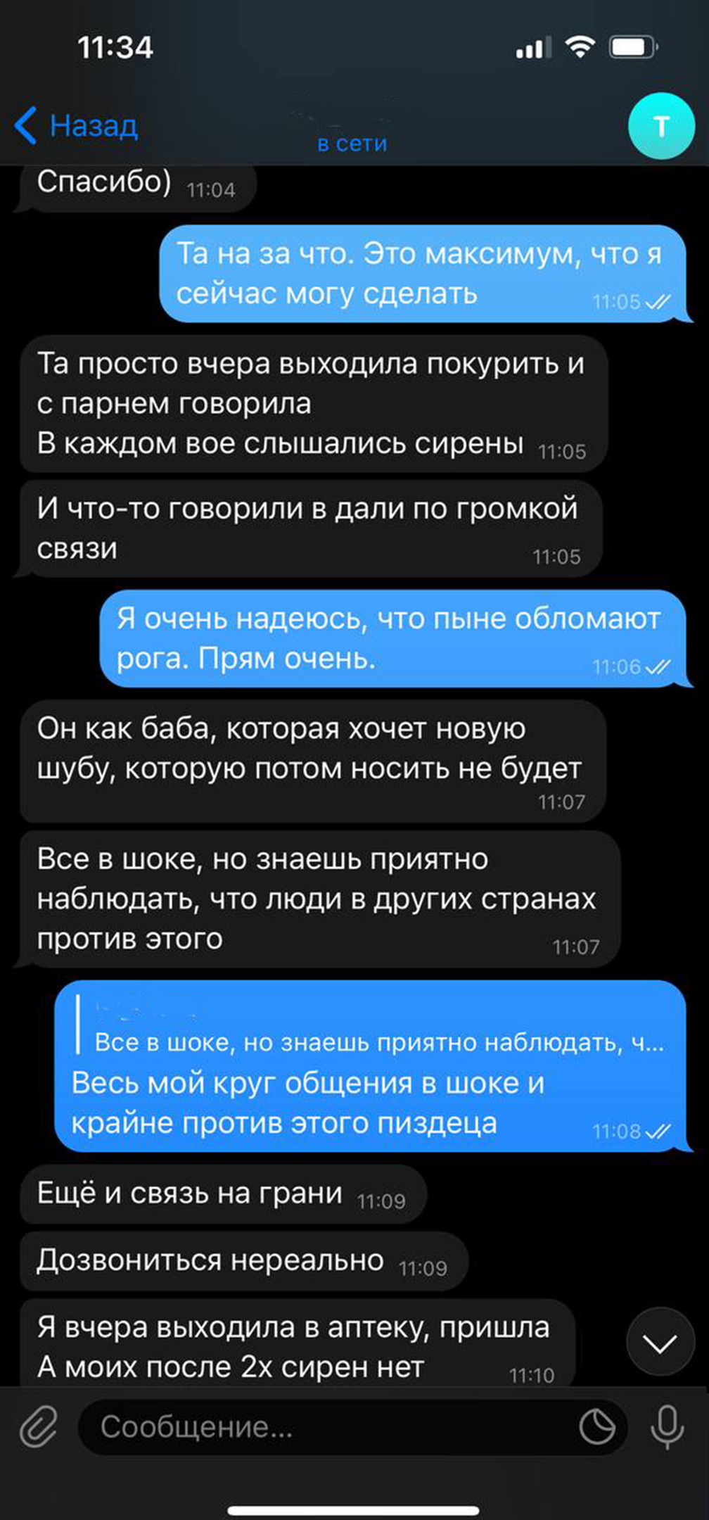 Прямо сейчас переписываюсь с подругой из Киева, ей повезло уехать из Академ городка до того, как там прозвучали первые взрывы. Дальше, если вы не против, будут скриншоты, от которых у меня шевелятся волосы на жопе.