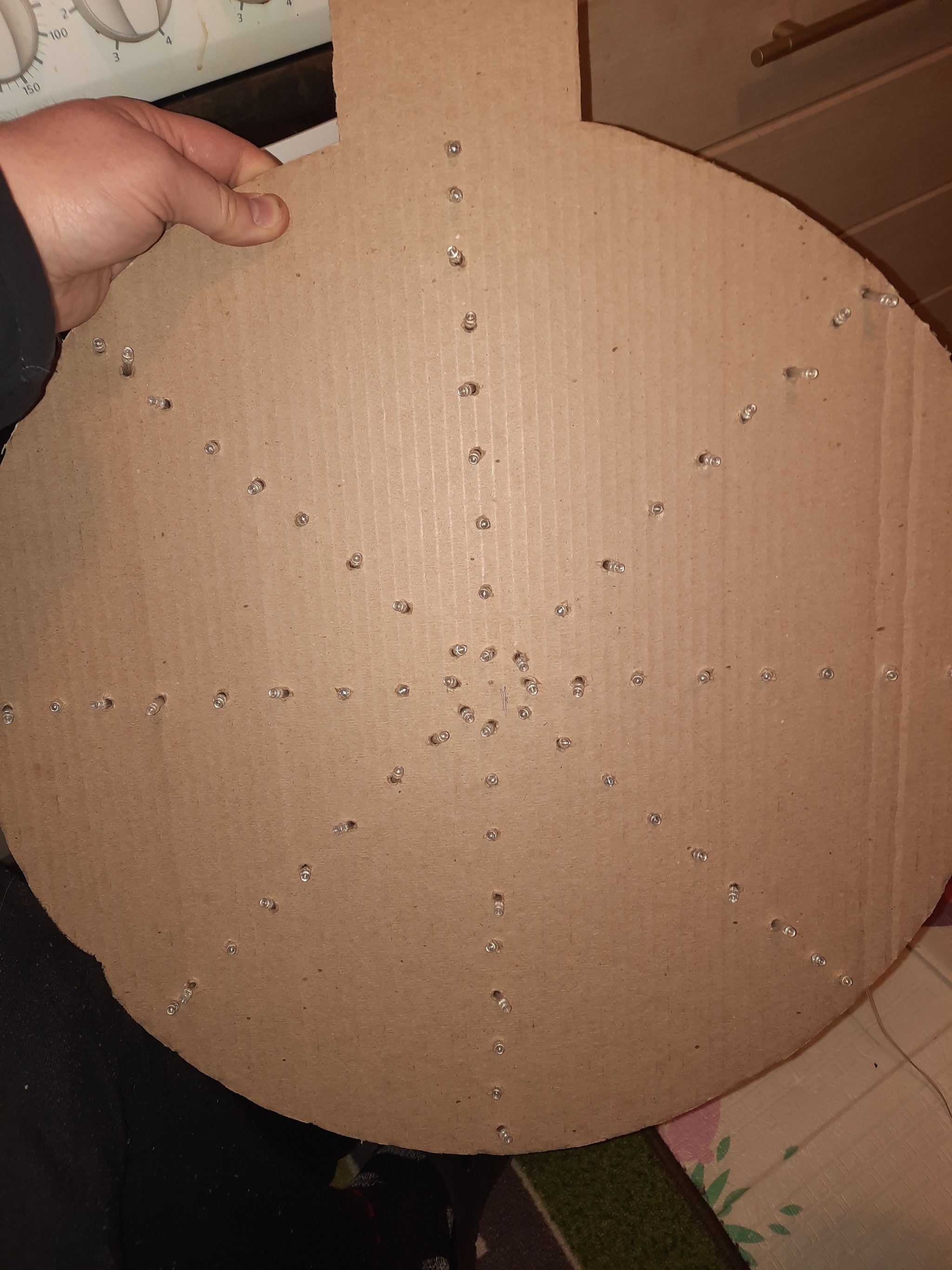 Осталось нарисовать круг на картонке (я оставил кусок, чтоб было похоже на ёлочную игрушку) вырезать его, посчитать количество дырок и вставить каждую лампочку в каждую дырку.