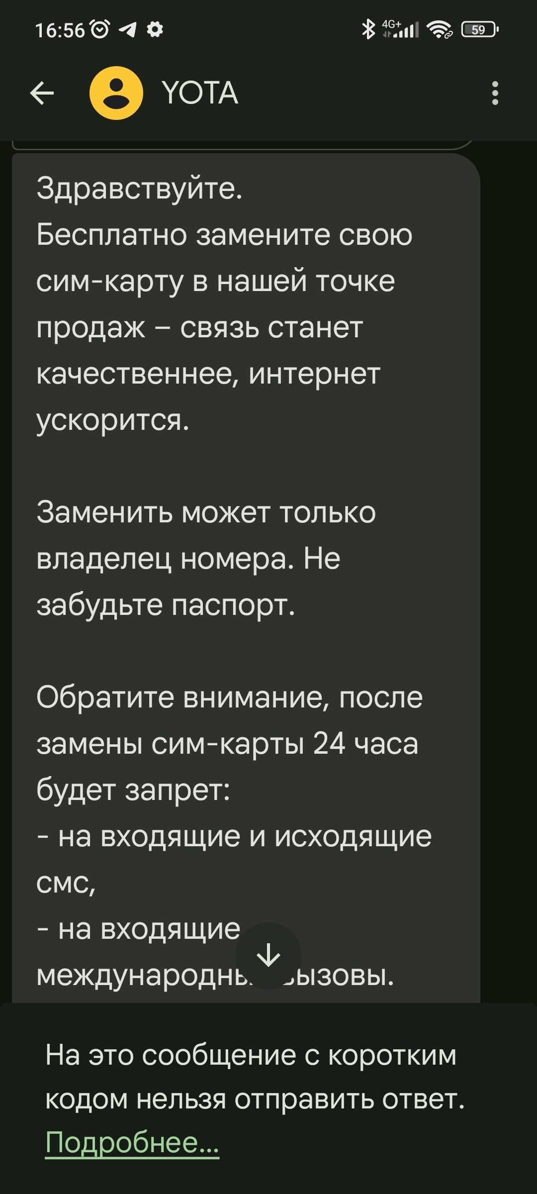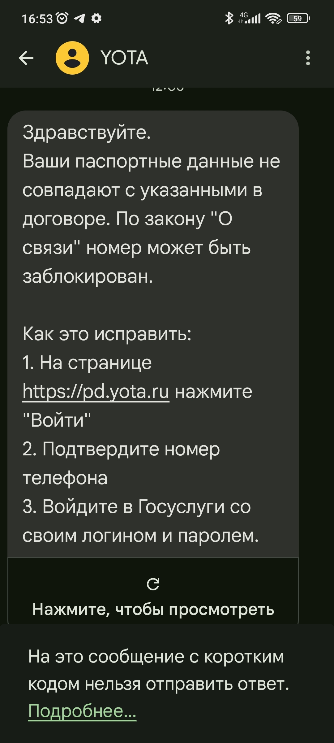 Буквально за пару дней до этого сообщения менял есим на физическу и попросил консультанта сверить ПД, все было верно. Через месяц начали писать что нужно сверить ПД через госуслуги.