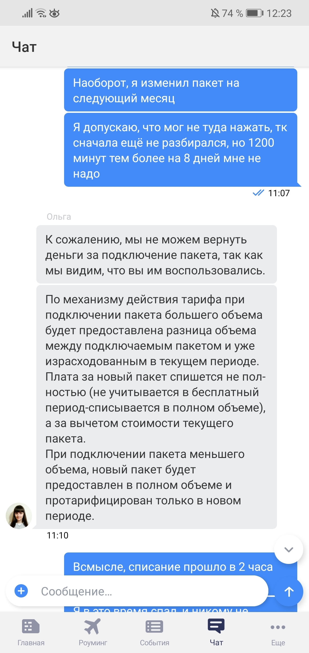 Но я решил все таки попробовать Тинькофф, прошло уже больше 10 дней, номер перенесли, 500 рублей начислили и пока я пользовался и разбирался с услугами, то узнал, что большинство обычных услуг здесь платные, по типу раздачи инета и тд, что в принципе сама стоимость услуг дороже раза в 2.5 (по сравнению с тем, какой у меня пакет был у Йоты). Но такое ужасное качество звонков, хотя и интернет довольно хороший. Правда, вчера вечером интернета, почему-то, вообще не было🤷. Я подумал, что дело в том, что закончился пробный период и нужно оплатить месяц, зашёл в приложение, поменял тариф на чуть поскромнее, иии.. и ничего не произошло. Сегодня уже захожу в приложение и вижу, что списали 250 рублей за 1200 минут на 8 дней, на 8 мать его дней, мать его 1200 минут. Лично мне столько даже даром не надо( +учитывая то, что я подключил 600 минут, то есть 1200 здесь даже не пахнет). Я написал в поддержку, мол что за ерунда зачем мне +1200 минут за 250 рублей на ПРОБНОМ пакете: