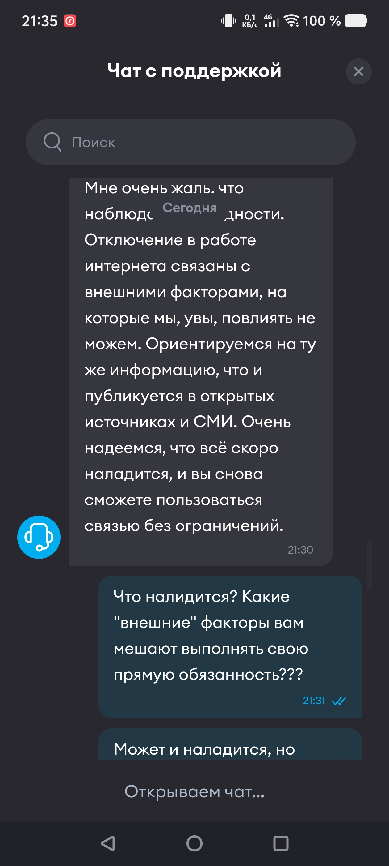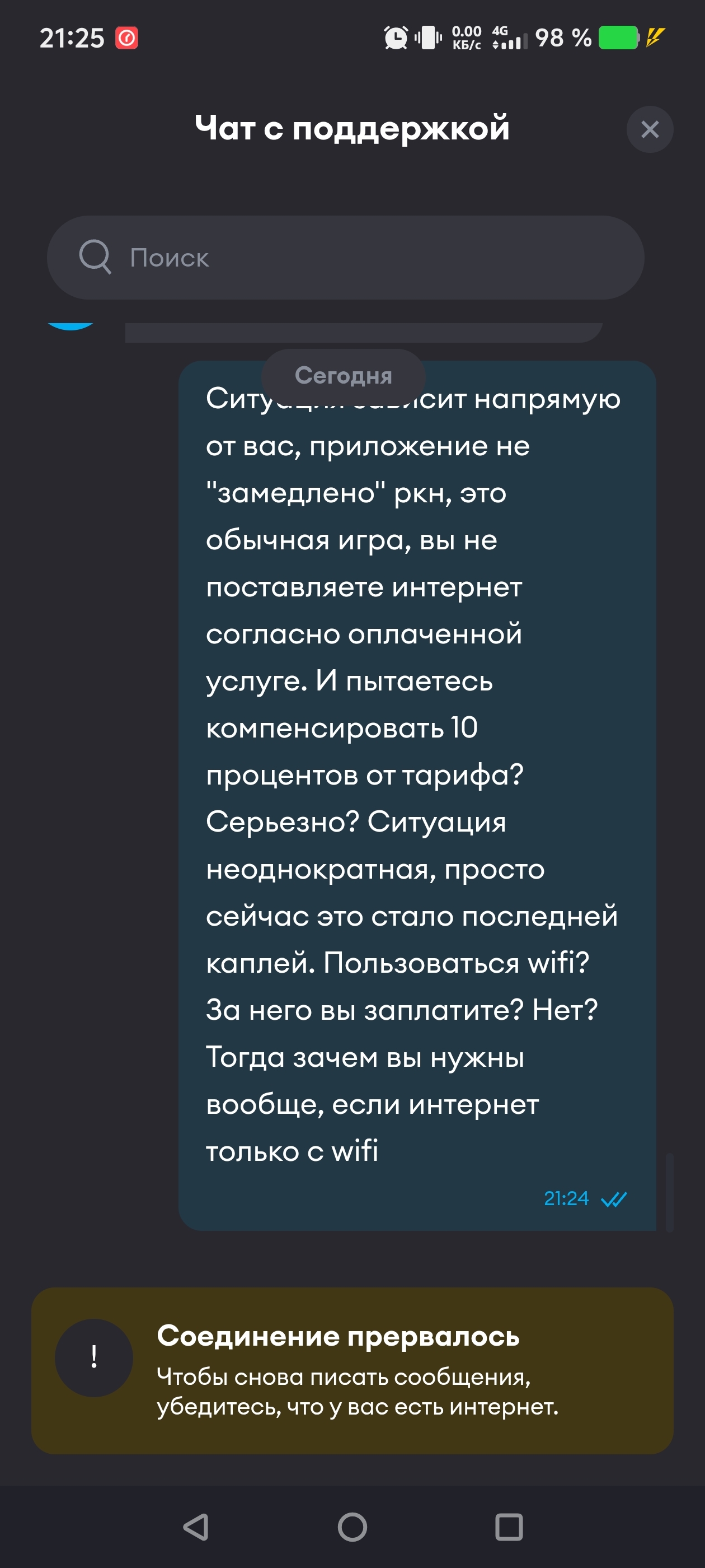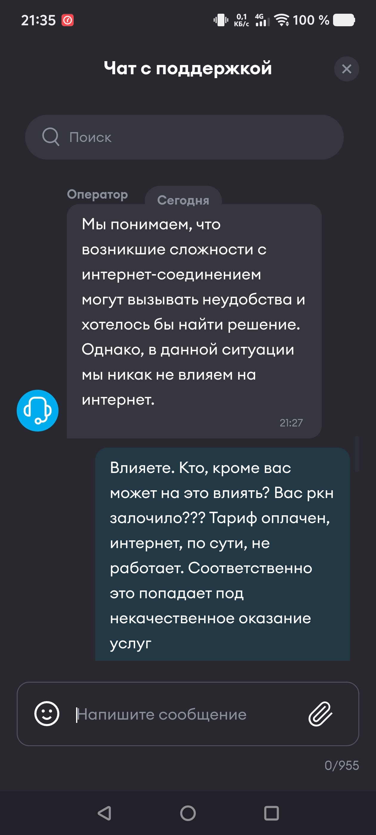 Уважаемая @Yota, а какого черта у вас со связью? Особенно круто советовать пользоваться своим wifi. Нахожусь в Сибири, тут рядом ни одного стратегического предприятия нет, чтоб связь была по нулям, с какого, интересно, чёрта, средства вы списываете как за безлимит, а при этом не поставляете услугу вообще? При этом приложения в "белом" списке типа ВК видео имеют приличную скорость. О каких "внешних" условиях говорит ваш консультант?