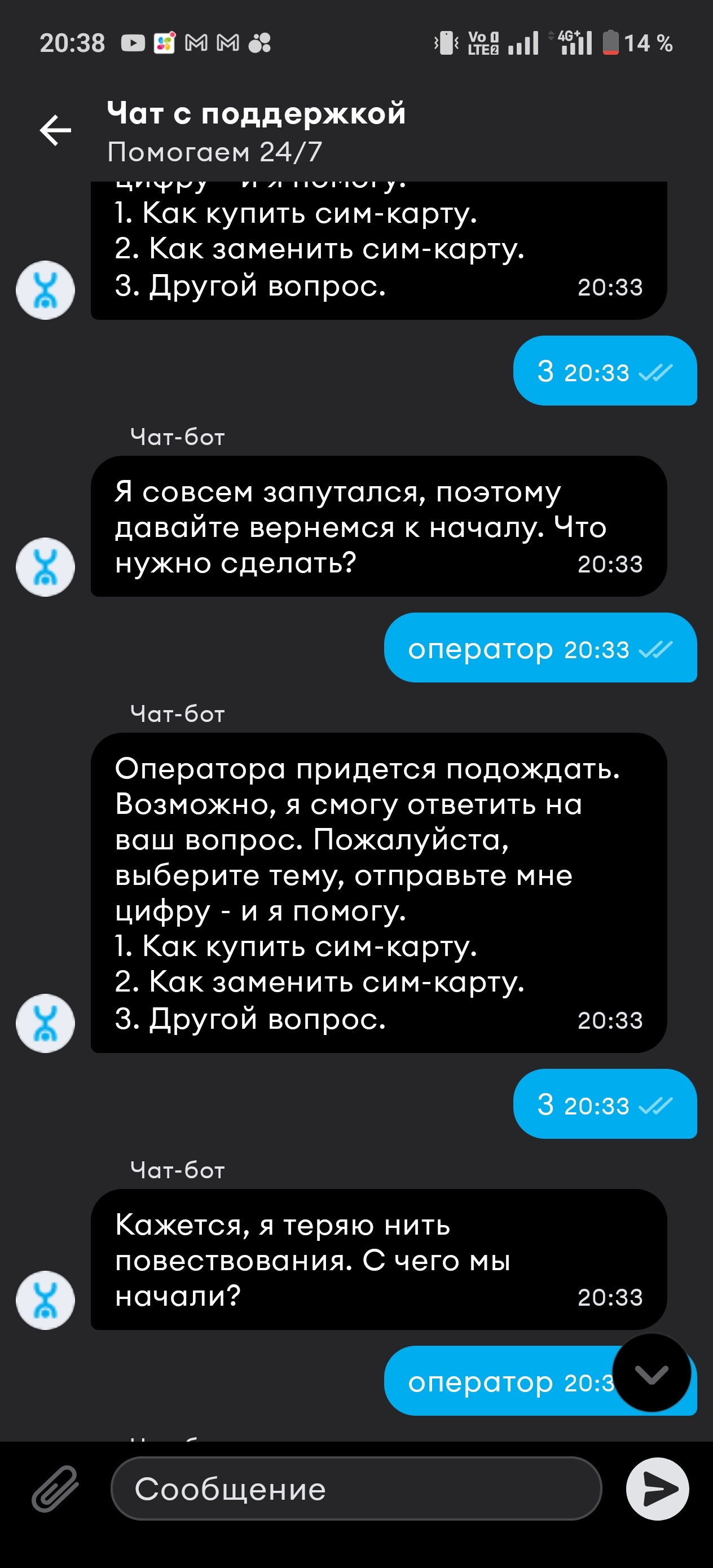 Уже писал про эту говно контору. Напишем ещё, пусть больше людей видя это откажутся от ваших услуг. Плату понимать не забывают, все мало никак не нажрутся. В качество оказываемых услуг все хуже. Они даже не могут сделать работоспособное приложение, которое как не странно работает на интернете от Билайна, а вот на своем собственном постоянно теряет соединение. Ну а написать оператору это целый квест