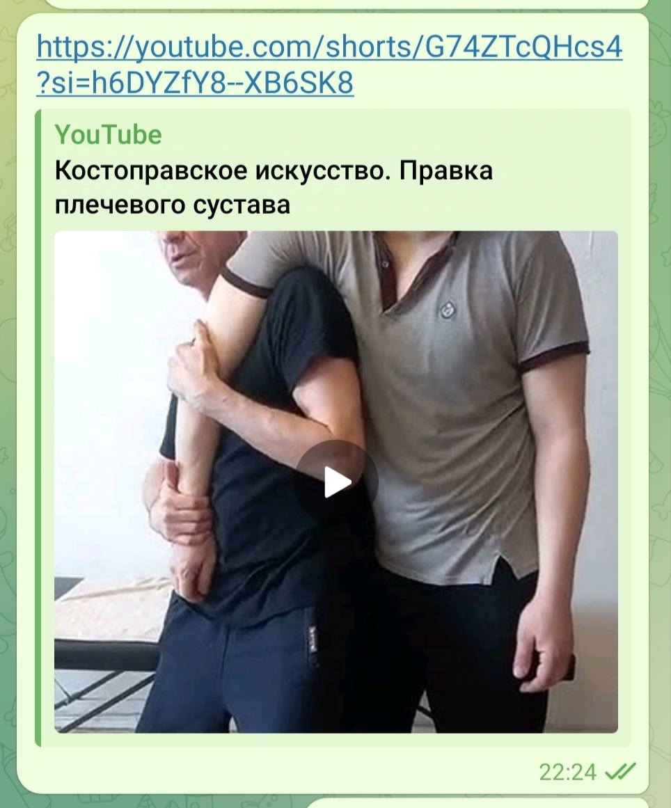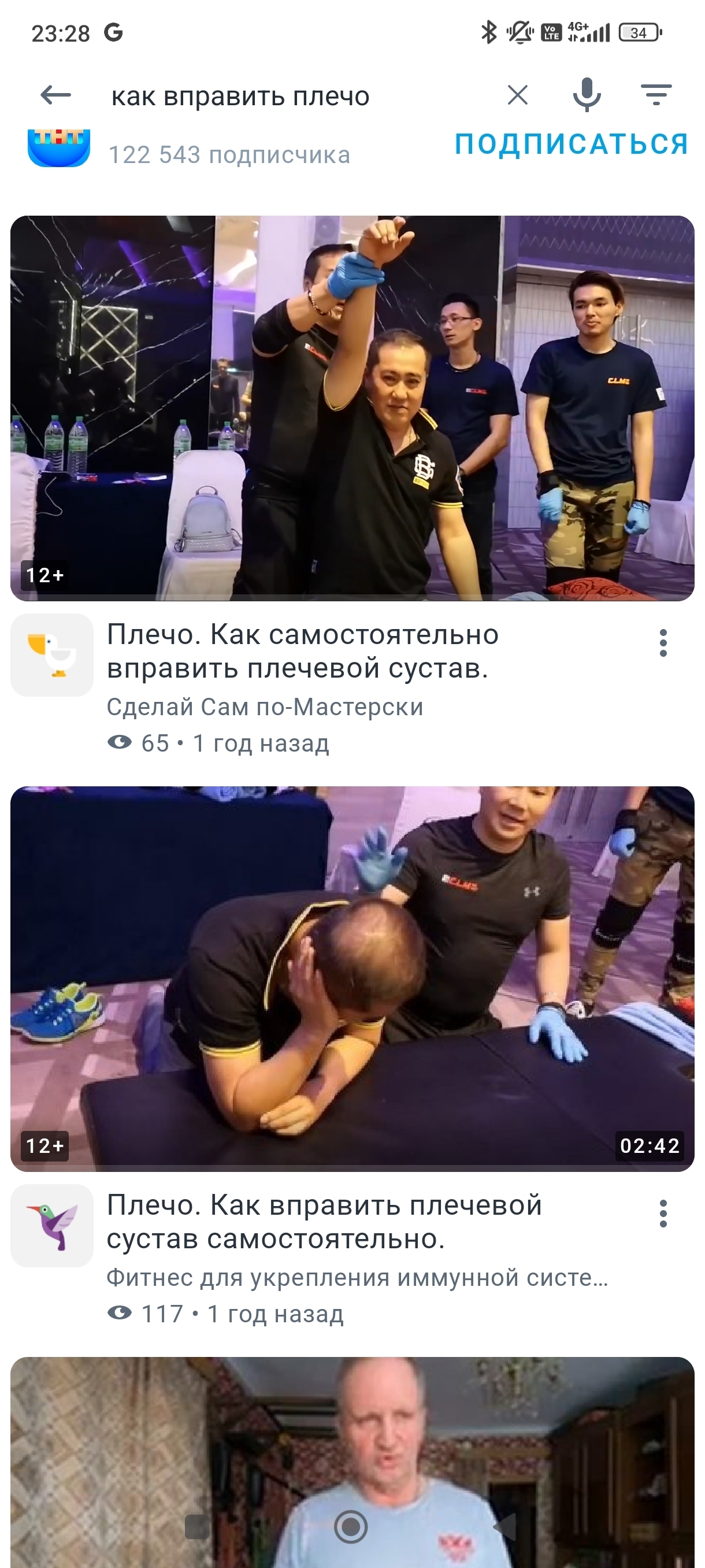 Почти месяц ныло плечо по причине и без. Особенно, если поднимал руку вверх. Сперва думал на растяжение после тренировки, но боль не проходила. Закралось подозрение, что плечо всë же чутка вылетело. Полез в «плохой» youtube. Первый же короткий видос наглядно показал как вправить плечо. Помогло. Спасибо Youtube.